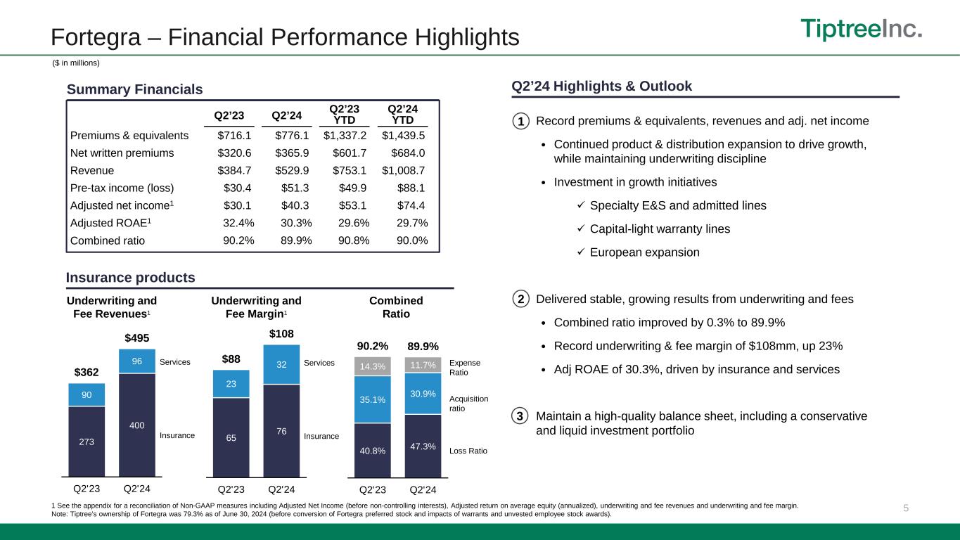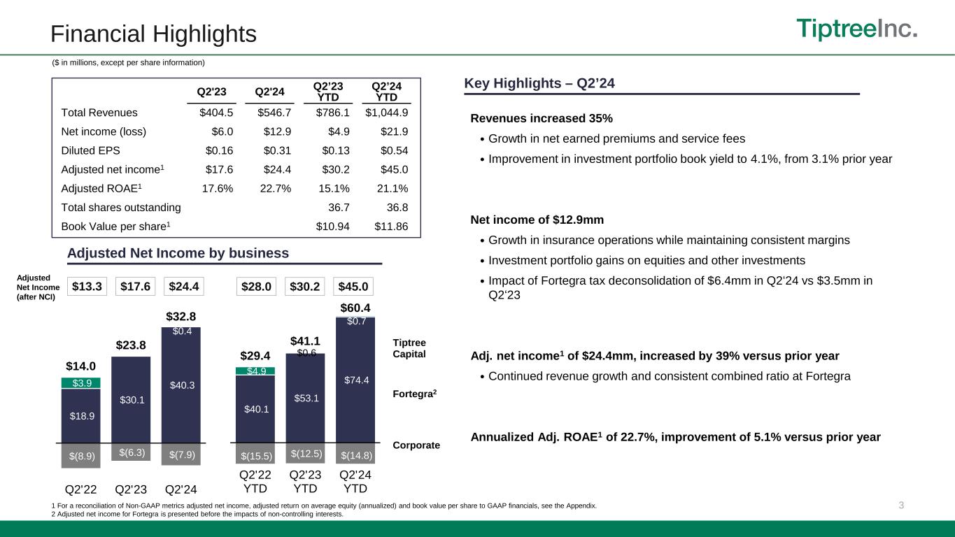 2 Q2 2024 Year-to-date Highlights Revenue $1.045 billion 32.9% vs. prior year Adjusted Net Income1 $45.0 million 48.9% vs. prior year Book Value per share1,3 $11.86 10.5% vs. 6/30/23 Net Income $21.9 million vs. prior year net income of $4.9million Overall Revenues of $1.045bn, an increase of 32.9% from 2023, driven by growth at Fortegra. Net income of $21.9mm. Adj. net income1 of $45mm, and 21.1% annualized adj. ROAE1, driven by growth in insurance operations. Insurance $40mm investment in Fortegra (existing shareholders) to support continued growth. $1.4bn of gross written premiums and premium equivalents (GWPPE), 8% increase from prior year, driven primarily by specialty E&S insurance lines. Net written premiums of $684mm, driven by organic growth and increased retention rates. Combined ratio of 90.0%, improved 0.8% from consistent underwriting performance and operating scale. Adj. net income1,2 of $74.4mm, up 40% from prior year driven by revenue growth and improved combined ratio. Annualized Adj. ROAE1,2 of 29.7%, compared to 29.6% in 2023. Tiptree Capital Pre-tax income of $4.5mm driven by investment gains and improved market conditions in the mortgage sector. ($ in millions, except per share information) 1 For a reconciliation of Non-GAAP metrics adjusted net income, adjusted return on average equity and book value per share to GAAP financials, see the Appendix. 2 Adjusted net income and adjusted return on average equity for insurance is presented before the impacts of non-controlling interests. 3 Annual total return defined as cumulative dividends paid of $0.22 per share plus change in book value per share as of June 30, 2024.
