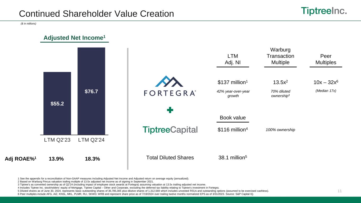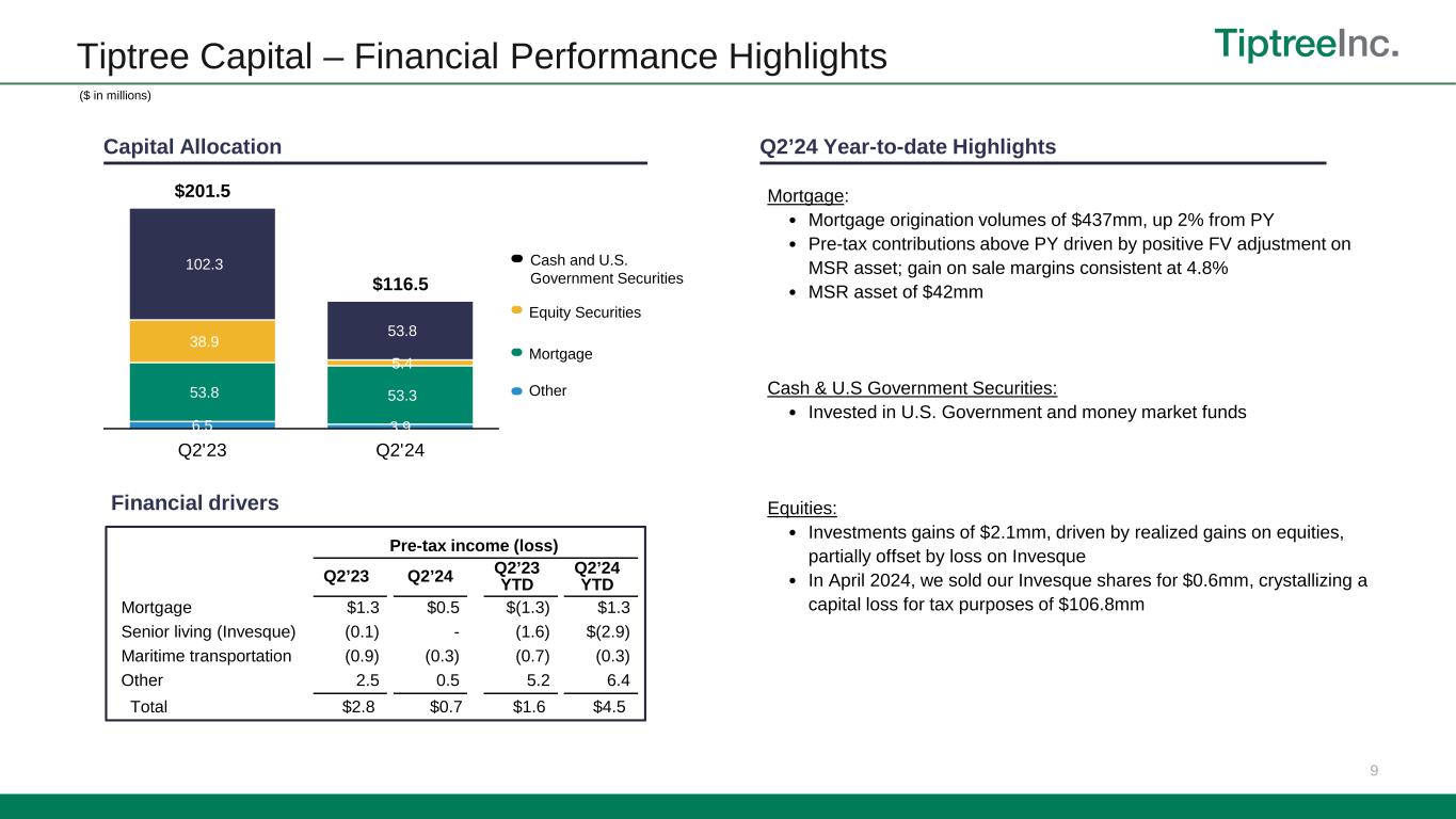 17 Non-GAAP Reconciliations – Adjusted Net Income The footnotes below correspond to the tables above, under “—Adjusted Net Income - Non-GAAP” and “—Adjusted Return on Average Equity - Non-GAAP”. 1 Net realized and unrealized gains (losses) added back in Adjusted net income excludes net realized and unrealized gains (losses) from the mortgage segment and unrealized gains (losses) on mortgage servicing rights. 2 Specifically associated with acquisition purchase accounting. See Note (8) Goodwill and Intangible Assets, net. 3 For the six months ended June 30, 2024, 2023, and 2022 included in other expenses were expenses related to legal and other expenses associated with preparation of the registration statement for the withdrawn Fortegra initial public offering in 2024 and acquisitions of services businesses in 2023 and 2022, respectively. 4 For the six months ended June 30, 2024, and 2023, non-cash fair-value adjustments represent a change in fair value of the Fortegra Additional Warrant liability. 5 For the six months ended June 30, 2024, 2023 and 2022, included in the adjustment is an add-back of $10.8 million, $5.8 million, and $25.5 million, respectively, related to deferred tax expense from the WP Transaction. 6 Tax on adjustments represents the tax applied to the total non-GAAP adjustments and includes adjustments for non-recurring or discrete tax impacts. 7 Total Adjusted return on average equity after non-controlling interests was 21.1%, 15.1%, and 14.5% for the six months ended June 30, 2024, 2023, and 2022 respectively, based on $45.0 million, $30.2 million, and $28.0 million of Adjusted net income over $426.7 million, $399.6 million, and $386.7 million of average Tiptree Inc. stockholders’ equity. ($ in thousands) Insurance Mortgage Other Corporate Total Insurance Mortgage Other Corporate Total Insurance Mortgage Other Corporate Total Income (loss) before taxes 88,061$ 1,281$ 3,205$ (22,202)$ 70,345$ 49,862$ (1,253)$ 2,897$ (19,659)$ 31,847$ 23,753$ 4,290$ 1,391$ (25,579)$ 3,855$ Less: Income tax (benefit) expense (23,490) (276) (808) (7,917) (32,491) (13,675) 307 (760) (2,718) (16,846) (7,334) (966) 494 (18,663) (26,469) Less: Net realized and unrealized gains (losses) 1 (5,364) (1,449) (2,038) - (8,851) 8,986 (145) (740) - 8,101 16,769 (7,894) 4,401 - 13,276 Plus: Intangibles amortization 2 7,698 - - - 7,698 7,789 - - - 7,789 8,031 - - - 8,031 Plus: Stock-based compensation expense 1,804 - - 5,428 7,232 521 - - 3,786 4,307 2,343 - 23 3,849 6,215 Plus: Non-recurring expenses 3 3,336 - - - 3,336 2,363 - - - 2,363 1,472 - (922) 2,108 2,658 Plus: Non-cash fair value adjustments 4 5,072 - - - 5,072 (164) - - - (164) - - 3,684 - 3,684 Plus: Impact of tax deconsolidation of Fortegra 5 - - - 10,822 10,822 - - - 5,814 5,814 1,560 - - 23,969 25,529 Less: Tax on adjustments 6 (2,668) 316 469 (892) (2,775) (2,624) 29 235 237 (2,123) (6,532) 1,831 (1,455) (1,185) (7,341) Adjusted net income (before NCI) 74,449$ (128)$ 828$ (14,761)$ 60,388$ 53,058$ (1,062)$ 1,632$ (12,540)$ 41,088$ 40,062$ (2,739)$ 7,616$ (15,501)$ 29,438$ Less: Impact of non-controlling interests (15,433) - - - (15,433) (10,899) - - - (10,899) (1,437) - - - (1,437) Adjusted net income 59,016$ (128)$ 828$ (14,761)$ 44,955$ 42,159$ (1,062)$ 1,632$ (12,540)$ 30,189$ 38,625$ (2,739)$ 7,616$ (15,501)$ 28,001$ Adjusted net income (before NCI) 74,449$ (128)$ 828$ (14,761)$ 60,388$ 53,058 (1,062) 1,632 (12,540) 41,088 40,062 (2,739) 7,616 (15,501) 29,438 Average stockholders’ equity 500,903 52,798 94,500 (50,884) 597,317 358,600$ 54,272$ 111,285$ 15,665$ 539,822$ 314,592$ 58,981$ 112,190$ (23,001)$ 462,762$ Adjusted return on average equity 7 29.7% (0.5)% 1.8% NM% 20.2% 29.6% (3.9)% 2.9% NM% 15.2% 25.5% (9.3)% 13.6% NM% 12.7% Tiptree Capital Six Months June 30, 2024 Six Months June 30, 2023 Six Months June 30, 2022 Tiptree Capital Tiptree Capital