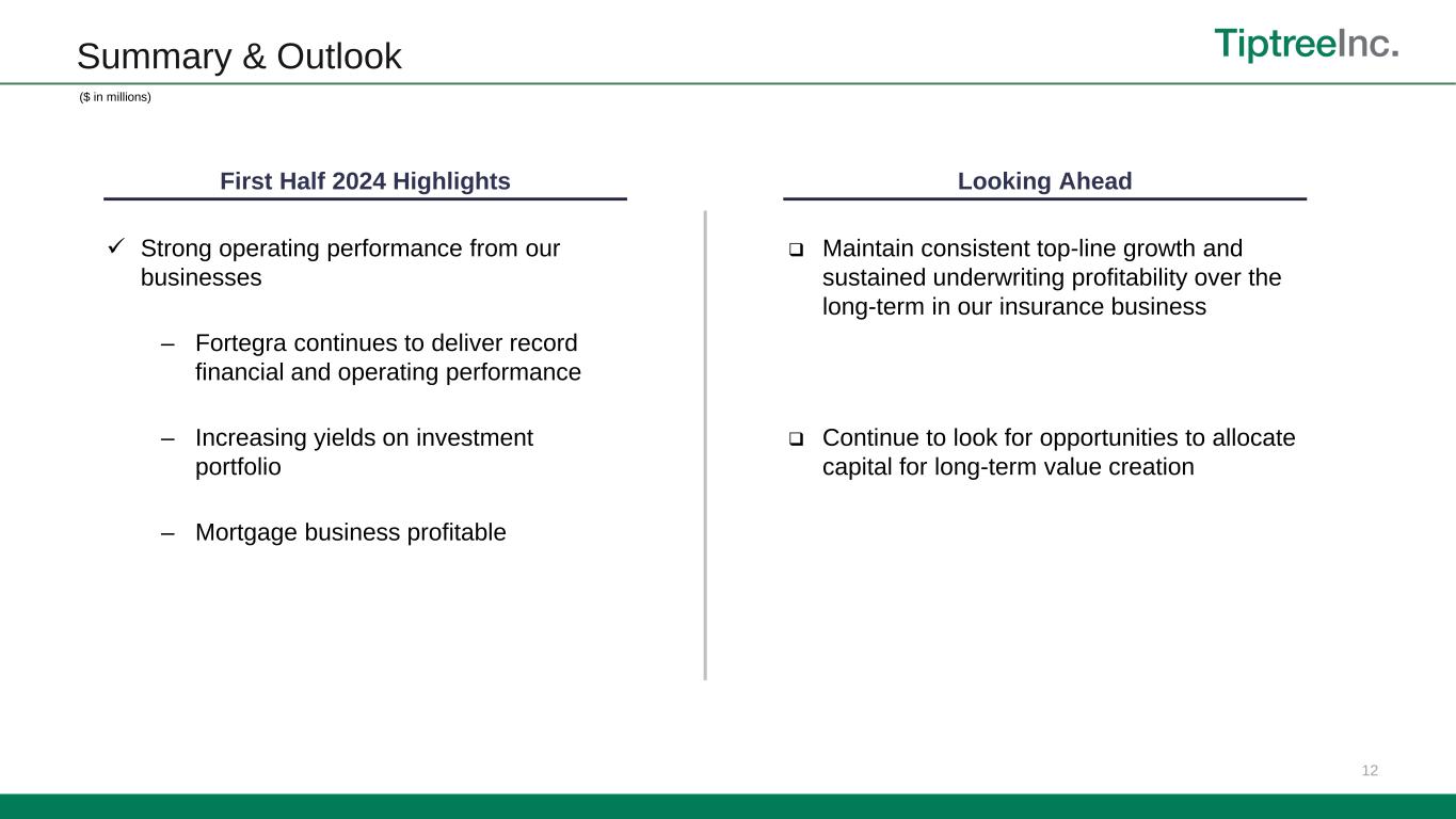 Continued Shareholder Value Creation 11 ($ in millions) Adjusted Net Income1 Adj ROAE%1 13.9% 18.3% $55.2 $76.7 LTM Q2'23 LTM Q2'24 $137 million1 $116 million4 10x – 32x6 (Median 17x) Peer Multiples LTM Adj. NI Warburg Transaction Multiple Total Diluted Shares 38.1 million5 13.5x2 1 See the appendix for a reconciliation of Non-GAAP measures including Adjusted Net Income and Adjusted return on average equity (annualized). 2 Based on Warburg Pincus valuation trailing multiple of 13.5x adjusted net income as of signing in September 2021. 3 Tiptree’s as converted ownership as of Q2’24 (including impact of employee stock awards at Fortegra) assuming valuation at 13.5x trailing adjusted net income. 4 Includes Tiptree Inc. stockholders’ equity of Mortgage, Tiptree Capital – Other and Corporate, excluding the deferred tax liability relating to Tiptree’s investment in Fortegra. 5 Diluted shares as of June 30, 2024, represents basic outstanding shares of 36,785,305 plus dilutive shares of 1,312,569 which includes unvested RSUs and outstanding options (assumed to be exercised cashless). 6 Peer multiples include AFG, AIZ, KNSL, MKL, PLMR, RLI, SKWD, WRB and represent share price as of 7/19/2024 over trailing twelve months normalized EPS as of 3/31/2023. Source: S&P Capital IQ. 70% diluted ownership3 100% ownership Book value 42% year-over-year growth