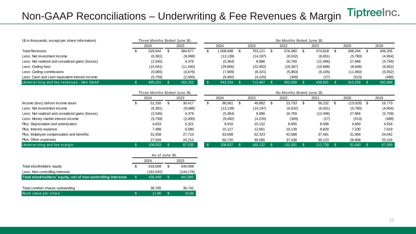 Non-GAAP Reconciliations 14 Adjusted Net Income We define adjusted net income as income before taxes, less provision (benefit) for income taxes, and excluding the after-tax impact of various expenses that we consider to be unique and non-recurring in nature, including merger and acquisition related expenses, stock-based compensation, net realized and unrealized gains (losses) and intangibles amortization associated with purchase accounting, all of which is reduced for non- controlling interests. The calculation of adjusted net income excludes net realized and unrealized gains (losses) that relate to investments or assets rather than business operations. Adjusted net income should not be viewed as a substitute for income before taxes calculated in accordance with GAAP, and other companies may define adjusted net income differently. Adjusted net income (before NCI) is presented before the impacts of non-controlling interests. We present adjustments for amortization associated with acquired intangible assets. The intangible assets were recorded as part of purchase accounting in connection with Tiptree’s acquisition of Fortegra Financial in 2014, Defend in 2019, and Smart AutoCare and Sky Auto in 2020, ITC in 2022 and Premia in 2023. The intangible assets acquired contribute to overall revenue generation, and the respective purchase accounting adjustments will continue to occur in future periods until such intangible assets are fully amortized in accordance with the respective amortization periods required by GAAP. We define adjusted return on average equity as adjusted net income expressed on an annualized basis as a percentage of average beginning and ending stockholder’s equity during the period. We use adjusted return on average equity as an internal performance measure in the management of our operations because we believe it gives our management and other users of our financial information useful insight into our results of operations and our underlying business performance. Adjusted return on average equity should not be viewed as a substitute for return on average equity calculated in accordance with GAAP, and other companies may define adjusted return on average equity differently. Book value per share Management believes the use of book value per share provides supplemental information useful to investors as it is frequently used by the financial community to analyze company growth on a relative per share basis. Insurance – Underwriting and Fee Revenues We generally manage our exposure to the underwriting risk we assume using both reinsurance (e.g., quota share and excess of loss) and retrospective commission agreements with our partners (e.g., commissions paid are adjusted based on the actual underlying losses incurred), which mitigate our risk. Period-over-period comparisons of revenues and expenses are often impacted by the Producer Owned Reinsurance Company (PORCs) and distribution partners’ choice as to whether to retain risk, specifically service and administration fees and ceding commissions, both components of revenue, and policy and contract benefits and commissions paid to our partners and reinsurers. Generally, when losses are incurred, the risk which is retained by our partners and reinsurers is reflected in a reduction in commissions paid. In order to better explain to investors the underwriting performance of the Company’s programs and the respective retentions between the Company and its agents and reinsurance partners, we use non-GAAP metrics of underwriting and fee revenues and underwriting and fee margin. We define underwriting and fee revenues as total revenues excluding net investment income, net realized gains (losses) and net unrealized gains (losses), ceding fees, ceding commissions and cash and cash equivalent interest income as reported in other income. Underwriting and fee revenues represents revenues generated by our underwriting and fee-based operations and allows us to evaluate our underwriting performance without regard to investment income. We use this metric as we believe it gives our management and other users of our financial information useful insight into our underlying business performance. Underwriting and fee revenues should not be viewed as a substitute for total revenues calculated in accordance with GAAP, and other companies may define underwriting and fee revenues differently. Insurance - Underwriting and Fee Margin We define underwriting and fee margin as income before taxes, excluding net investment income, net realized gains (losses), net unrealized gains (losses), cash and cash equivalent interest income, employee compensation and benefits, other expenses, interest expense and depreciation and amortization. Underwriting and fee margin represents the underwriting performance of our underwriting and fee-based programs. As such, underwriting and fee margin excludes general administrative expenses, interest expense, depreciation and amortization and other corporate expenses as those expenses support the vertically integrated business model and not any individual component of our business mix. We use this metric as we believe it gives our management and other users of our financial information useful insight into the specific performance of our underlying underwriting and fee programs. Underwriting and fee income should not be viewed as a substitute for income before taxes calculated in accordance with GAAP, and other companies may define underwriting and fee margin differently.