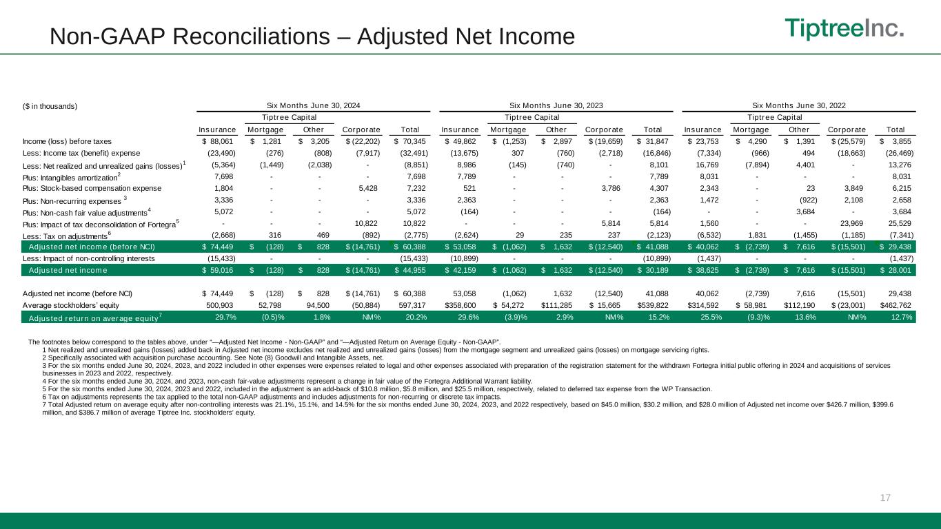 16 Non-GAAP Reconciliations – Adjusted Net Income The footnotes below correspond to the tables above, under “—Adjusted Net Income - Non-GAAP” and “—Adjusted Return on Average Equity - Non-GAAP”. 1 Net realized and unrealized gains (losses) added back in Adjusted net income excludes net realized and unrealized gains (losses) from the mortgage segment and unrealized gains (losses) on mortgage servicing rights. 2 Specifically associated with acquisition purchase accounting. See Note (8) Goodwill and Intangible Assets, net. 3 For the three months ended June 30, 2024, 2023, and 2022 included in other expenses were expenses related to legal and other expenses associated with preparation of the registration statement for the withdrawn Fortegra initial public offering in 2024 and acquisitions of services businesses in 2023 and 2022, respectively. 4 For the three months ended June 30, 2024, and 2023, non-cash fair-value adjustments represent a change in fair value of the Fortegra Additional Warrant liability. 5 For the three months ended June 30, 2024, 2023 and 2022, included in the adjustment is an add-back of $6.4 million, $3.5 million, and $25.5 million, respectively, related to deferred tax expense from the WP Transaction. 6 Tax on adjustments represents the tax applied to the total non-GAAP adjustments and includes adjustments for non-recurring or discrete tax impacts. 7 Total Adjusted return on average equity after non-controlling interests was 22.7%, 17.6%, and 14.1% for the three months ended June 30, 2024, 2023, and 2022 respectively, based on $24.4 million, $17.6 million, and $13.3 million of Adjusted net income over $430.6 million, $401.3 million, and $378.5 million of average Tiptree Inc. stockholders’ equity. ($ in thousands) Insurance Mortgage Other Corporate Total Insurance Mortgage Other Corporate Total Insurance Mortgage Other Corporate Total Income (loss) before taxes 51,250$ 528$ 212$ (11,344)$ 40,646$ 30,417$ 1,312$ 1,455$ (9,510)$ 23,674$ 9,071$ 24$ 9,042$ (13,330)$ 4,807$ Less: Income tax (benefit) expense (13,568) (113) (116) (4,876) (18,673) (8,928) (306) (497) (2,093) (11,824) (3,670) 12 (1,300) (21,597) (26,555) Less: Net realized and unrealized gains (losses) 1 (2,545) (289) 103 - (2,731) 4,379 (1,588) (1,063) - 1,728 10,126 (1,580) (4,450) - 4,096 Plus: Intangibles amortization 2 3,727 - - - 3,727 3,895 - - - 3,895 4,085 - - - 4,085 Plus: Stock-based compensation expense 1,022 - - 2,375 3,397 488 - - 1,504 1,992 24 - 23 10 57 Plus: Non-recurring expenses 3 166 - - - 166 238 - - - 238 1,449 - (1,055) 2,108 2,502 Plus: Non-cash fair value adjustments 4 861 - - - 861 (46) - - - (46) - - 2,170 - 2,170 Plus: Impact of tax deconsolidation of Fortegra 5 - - - 6,357 6,357 - - - 3,500 3,500 1,560 - - 23,969 25,529 Less: Tax on adjustments 6 (597) 55 (24) (405) (971) (324) 373 324 274 647 (3,707) 361 658 (17) (2,705) Adjusted net income (before NCI) 40,316$ 181$ 175$ (7,893)$ 32,779$ 30,119$ (209)$ 219$ (6,325)$ 23,804$ 18,938$ (1,183)$ 5,088$ (8,857)$ 13,986$ Less: Impact of non-controlling interests (8,357) - - - (8,357) (6,174) - - - (6,174) (672) (672) Adjusted net income 31,959$ 181$ 175$ (7,893)$ 24,422$ 23,945$ (209)$ 219$ (6,325)$ 17,630$ 18,266$ (1,183)$ 5,088$ (8,857)$ 13,314$ Adjusted net income (before NCI) 40,316$ 181$ 175$ (7,893)$ 32,779$ 30,119$ (209)$ 219$ (6,325)$ 23,804$ 18,938$ (1,183)$ 5,088$ (8,857)$ 13,986$ Average stockholders’ equity 531,447$ 53,092$ 66,580$ (42,766)$ 608,353$ 371,843$ 53,297$ 150,672$ (31,999)$ 543,813$ 309,774$ 57,537$ 108,019$ (21,082)$ 454,248$ Adjusted return on average equity 7 30.3% 1.4% 1.1% NM% 21.6% 32.4% (1.6)% 0.6% NM% 17.5% 24.5% (8.2)% 18.8% NM% 12.3% Three Month Ended June 30, 2022 Tiptree CapitalTiptree Capital Three Months Ended June 30, 2024 Tiptree Capital Three Months Ended June 30, 2023