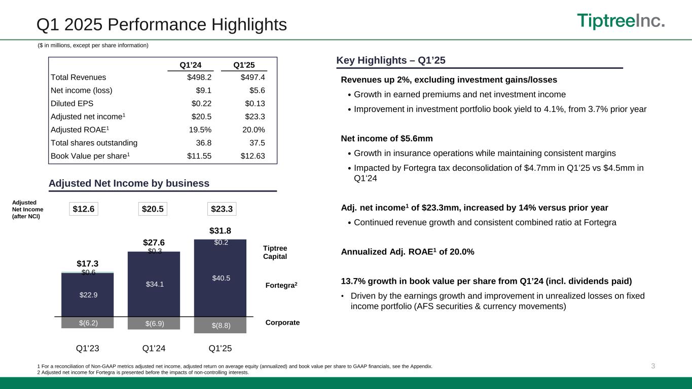 2 Q1 2025 Highlights Revenue $497.4 million (0.2)% vs. prior year Adjusted Net Income1 $23.3 million 13.6% vs. prior year Book Value per share1,3 $12.63 13.7% vs. 3/31/25 Net Income $5.6 million vs. prior year net income of $9.1 million Overall Revenues of $497.4 million, a decrease of 0.2% from 2024. Excluding investment gains and losses, revenues increased 1.8%. Net income of $5.6mm. Adj. net income1 of $23.3mm, and 20.0% annualized adj. ROAE1, driven by growth in insurance operations. Insurance $753.2mm of gross written premiums and premium equivalents (GWPPE), 13.5% increase from prior year, driven primarily by specialty E&S insurance lines. Net written premiums of $357.7mm, 12.4% increase from Q1’24. Combined ratio of 89.9%, improved 0.4% from Q1’24, driven by consistent underwriting performance and operating scale. Adj. net income1,2 of $40.5mm, up 18.6% from prior year driven by revenue growth and improved combined ratio. Annualized Adj. ROAE1,2 of 25.0%. Tiptree Capital Mortgage loss before taxes was $0.2mm, driven by lower origination volumes and unrealized losses on our mortgage servicing asset, partially offset by higher loan servicing fees. ($ in millions, except per share information) 1 For a reconciliation of Non-GAAP metrics adjusted net income, adjusted return on average equity and book value per share to GAAP financials, see the Appendix. 2 Adjusted net income and adjusted return on average equity for insurance is presented before the impacts of non-controlling interests. 3 Annual total return defined as cumulative dividends paid of $0.49 per share plus change in book value per share as of March 31, 2025.