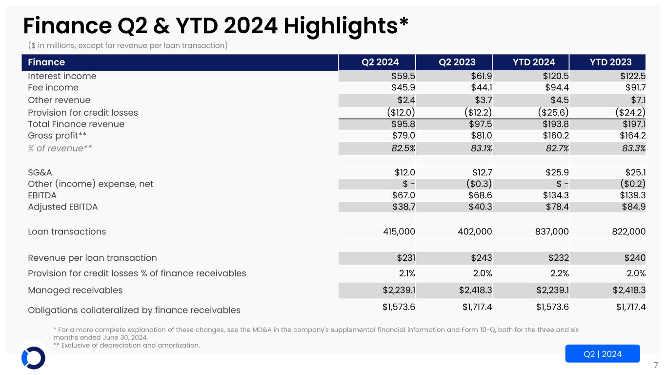 For the three months ended June 30, 2024, the Finance segment revenue decreased $1.7 million, or 2%, to $95.8 million, compared with $97.5 million for the three months ended June 30, 2023. The decrease in revenue was primarily the result of a 5% decrease in revenue per loan transaction, partially offset by a 3% increase in loan transactions.