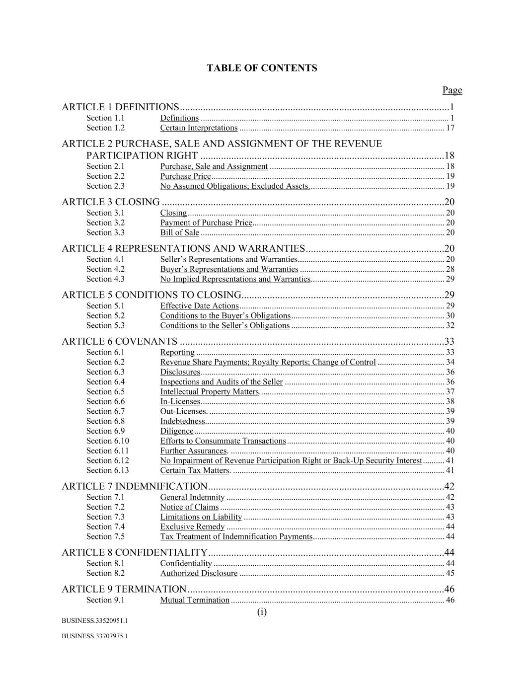 12 BUSINESS.33520951.1 BUSINESS.33707975.1 “Out-License” means each license or other agreement between the Seller or any of its Affiliates and any Third Party (other than Distributors) pursuant to which the Seller or any of its Affiliates grants a license, sublicense, or other rights to practice any Patents or other intellectual property rights to research, develop, manufacture, use, or Commercialize the Product. “Out-License Date” is defined in Section 6.7(a). “Patent Rights” means any and all Patents, as well as any Patents covering any Improvements, owned or in-licensed by the Seller or any of its Affiliates or under which the Seller or any of its Affiliates is or may become empowered to grant licenses necessary for or used in the research, development, manufacture, use, or Commercialization of the Product, including the Patents listed on Schedule 4.1(k)(i). “Patent Rights Updates” means an updated list of the Patent Rights, including any new Patents issued or filed, amended or supplemented, or any abandonments or other termination of prosecution with respect to any of the Patent Rights, and any other material information or developments with respect to the Patent Rights. “Patents” means any and all patents and patent applications existing as of the date of this Agreement and all patent applications filed hereafter, including any continuation, continuation- in-part, division, provisional or any substitute applications, any patent issued with respect to any of the foregoing patent applications, any certificate, reissue, reexamination, renewal or patent term extension or adjustment (including any supplementary protection certificate) of any such patent or other governmental actions which extend any of the subject matter of a patent, and any substitution patent, confirmation patent or registration patent or patent of addition based on any such patent, and all foreign counterparts of any of the foregoing. “Permit” is defined in Section 4.1(g)(viii). “Permitted Indebtedness” means: (a) true sales of royalties or revenue interests (in each instance including via a monetization) entered into after [***] that contain no financial covenants or other provisions typically found in loan agreements, and in connection with such true sale Seller or its Affiliates do not grant any Lien on any assets of Seller or its Affiliates, other than a back-up security interest to perfect the true sale; and (b) subject to the prior written consent of the Buyer, secured Indebtedness, so long as (x) the holders of such secured Indebtedness or any agent, representative or trustee acting on behalf of such holders have entered into an intercreditor agreement with the Buyer in form and substance consistent with current industry standards and reasonably satisfactory to the Buyer and (y) the lien supporting such secured Indebtedness does not extend to the Revenue Participation Right; provided, that the principal amount of any secured Indebtedness incurred pursuant to this clause (ii) (together with the aggregate outstanding principal amount of all Indebtedness previously incurred by the Seller, including with respect to the refinancing of the Seller’s existing Indebtedness) does not at the time of incurring such Indebtedness