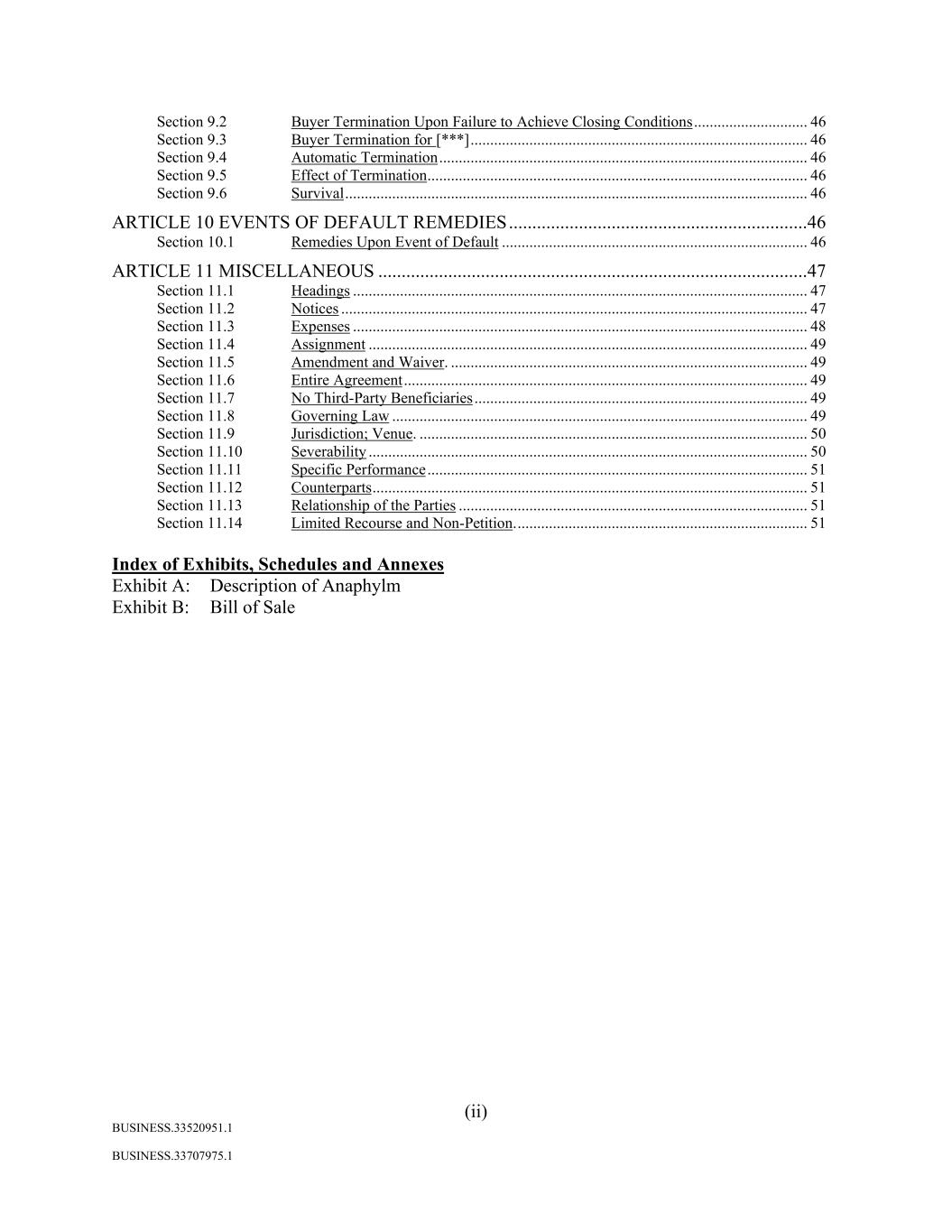 13 BUSINESS.33520951.1 BUSINESS.33707975.1 exceed (A) [***], (B) after the Marketing Approval, $[***] or (C) so long as the Seller has (I) a market capitalization greater [***] measured as of the time such secured Indebtedness is incurred, and (II) Net Sales in excess of [***]) for the trailing twelve-month period ending the last full month prior to the incurrence of such secured Indebtedness, then an amount equal to [***] of the Seller’s market capitalization, measured as of the time such secured Indebtedness is incurred. “Permitted License” is defined in Section 6.7(a). “Permitted Liens” means any lien granted in connection with Permitted Indebtedness. “Person” means any individual, firm, corporation, company, partnership, limited liability company, trust, joint venture, association, estate, trust, Governmental Entity or other entity, enterprise, association or organization. “Prime Rate” means the prime rate published by The Wall Street Journal, from time to time, as the prime rate. “Product” means all current and future pharmaceutical products developed or to be developed by the Seller or any of its Affiliates, for the treatment of type I allergic reactions, including anaphylaxis, containing or comprising individually and collectively, (a) Anaphylm; (b) [***], and (c) [***]. “Product Collateral” means the Seller’s or any of its Affiliate’s rights, title and interests in any and all of the following as they exist in the Territory: (a) the Revenue Share Payments; (b) the Product Rights owned, licensed or otherwise held by the Seller, and (c) any proceeds from either (a) or (b) above, including all accounts receivable and general intangibles of Seller or its Affiliates resulting from the sale, license or other disposition of the Product in the Territory by the Seller, its Affiliates, or its Licensees. “Product Rights” means any and all of the following: (a) Intellectual Property Rights, (b) regulatory filings, submissions and approvals, including Marketing Approvals, with or from any Regulatory Authorities with respect to the Product, (c) In-Licenses and (d) Out-Licenses. “Purchase Price” is defined in Section 2.2. “Qualified Person” means any pharmaceutical company that is a Third Party with (a) a market capitalization greater than [***] for [***] consecutive trading days on a Major Stock Exchange or (b) annual net revenue, in accordance with GAAP, in excess of [***] in each case ((a) and (b)), measured as of the date the definitive agreement for the applicable Change of Control or Permitted License is executed. “Ratchet” is defined in the definition of “Revenue Share Rate”. “Ratchet Cure” is defined in the definition of “Revenue Share Rate”. “Ratchet Threshold” is defined in the definition of “Revenue Share Rate”.