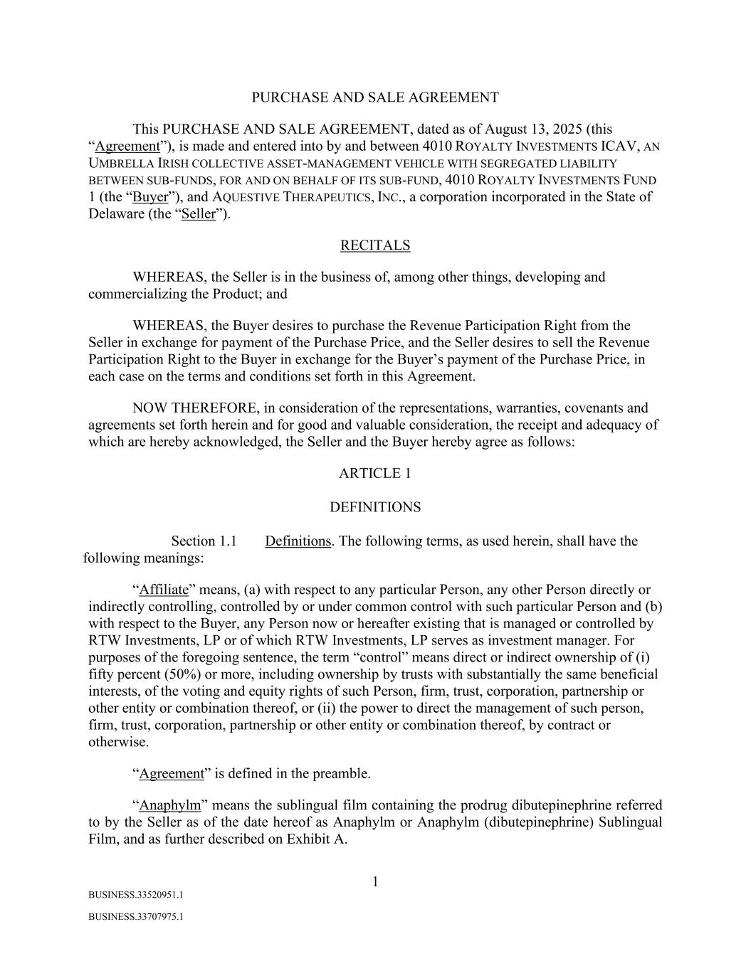[Signature Page to Purchase and Sale Agreement] BUSINESS.33520951.1 BUSINESS.33707975.1 IN WITNESS WHEREOF, the parties hereto have caused this Agreement to be executed and delivered by their respective representatives thereunto duly authorized as of the date first above written. SELLER AQUESTIVE THERAPEUTICS, INC. By: /s/ Daniel Barber Name: Daniel Barber Title: Chief Executive Officer and President BUYER 4010 ROYALTY INVESTMENTS ICAV, AN UMBRELLA IRISH COLLECTIVE ASSET-MANAGEMENT VEHICLE WITH SEGREGATED LIABILITY BETWEEN SUB-FUNDS, FOR AND ON BEHALF OF ITS SUB-FUND, 4010 ROYALTY INVESTMENTS FUND 1 By: /s/ Roderick Wong, M.D. Name: Roderick Wong, M.D. Title: Managing Partner