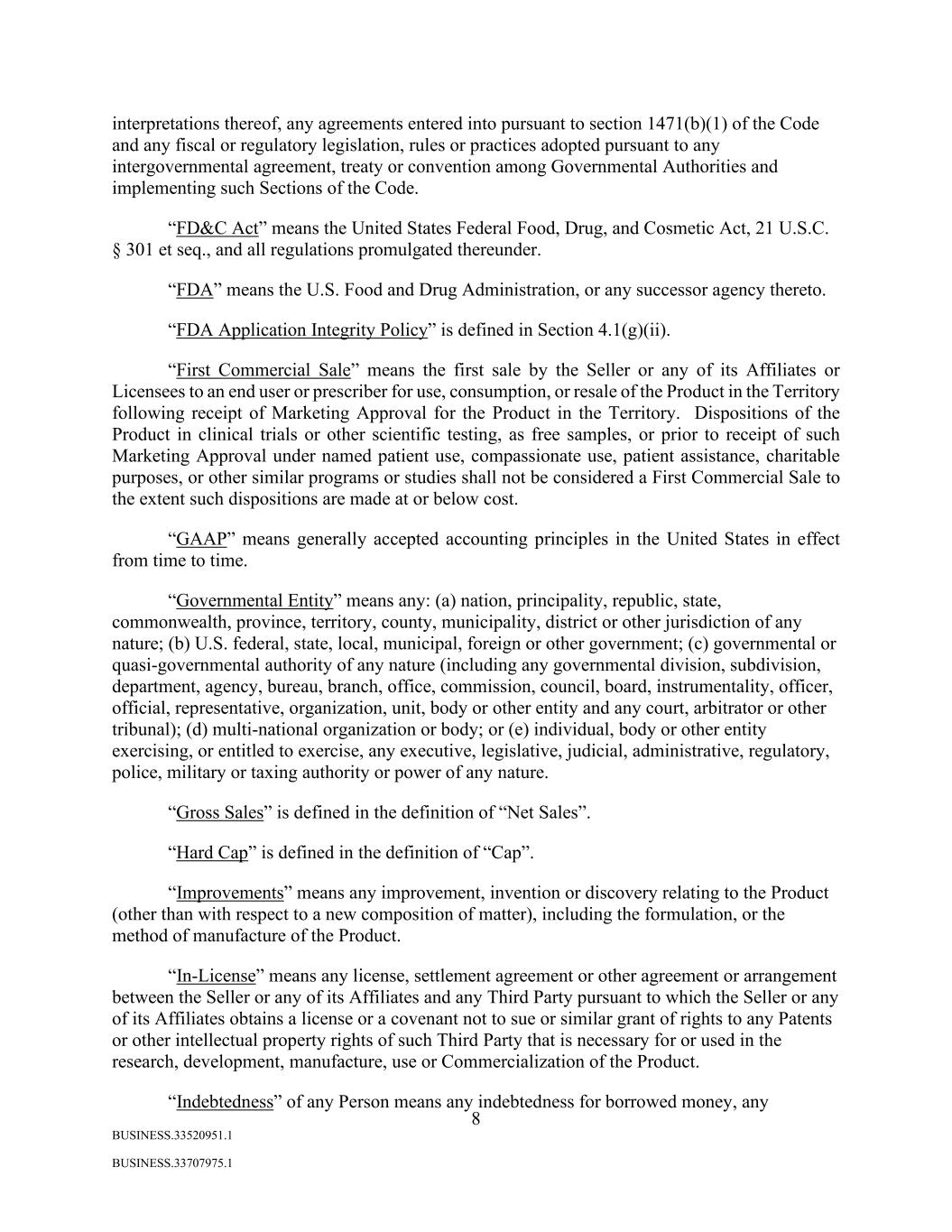 8 BUSINESS.33520951.1 BUSINESS.33707975.1 interpretations thereof, any agreements entered into pursuant to section 1471(b)(1) of the Code and any fiscal or regulatory legislation, rules or practices adopted pursuant to any intergovernmental agreement, treaty or convention among Governmental Authorities and implementing such Sections of the Code. “FD&C Act” means the United States Federal Food, Drug, and Cosmetic Act, 21 U.S.C. § 301 et seq., and all regulations promulgated thereunder. “FDA” means the U.S. Food and Drug Administration, or any successor agency thereto. “FDA Application Integrity Policy” is defined in Section 4.1(g)(ii). “First Commercial Sale” means the first sale by the Seller or any of its Affiliates or Licensees to an end user or prescriber for use, consumption, or resale of the Product in the Territory following receipt of Marketing Approval for the Product in the Territory. Dispositions of the Product in clinical trials or other scientific testing, as free samples, or prior to receipt of such Marketing Approval under named patient use, compassionate use, patient assistance, charitable purposes, or other similar programs or studies shall not be considered a First Commercial Sale to the extent such dispositions are made at or below cost. “GAAP” means generally accepted accounting principles in the United States in effect from time to time. “Governmental Entity” means any: (a) nation, principality, republic, state, commonwealth, province, territory, county, municipality, district or other jurisdiction of any nature; (b) U.S. federal, state, local, municipal, foreign or other government; (c) governmental or quasi-governmental authority of any nature (including any governmental division, subdivision, department, agency, bureau, branch, office, commission, council, board, instrumentality, officer, official, representative, organization, unit, body or other entity and any court, arbitrator or other tribunal); (d) multi-national organization or body; or (e) individual, body or other entity exercising, or entitled to exercise, any executive, legislative, judicial, administrative, regulatory, police, military or taxing authority or power of any nature. “Gross Sales” is defined in the definition of “Net Sales”. “Hard Cap” is defined in the definition of “Cap”. “Improvements” means any improvement, invention or discovery relating to the Product (other than with respect to a new composition of matter), including the formulation, or the method of manufacture of the Product. “In-License” means any license, settlement agreement or other agreement or arrangement between the Seller or any of its Affiliates and any Third Party pursuant to which the Seller or any of its Affiliates obtains a license or a covenant not to sue or similar grant of rights to any Patents or other intellectual property rights of such Third Party that is necessary for or used in the research, development, manufacture, use or Commercialization of the Product. “Indebtedness” of any Person means any indebtedness for borrowed money, any