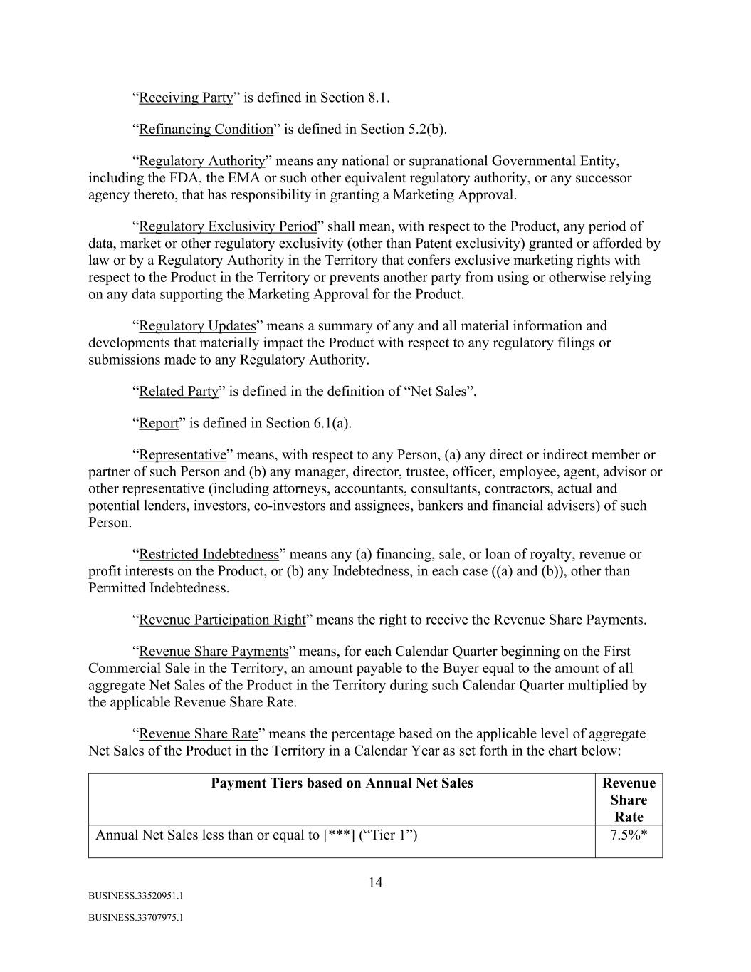 14 BUSINESS.33520951.1 BUSINESS.33707975.1 “Receiving Party” is defined in Section 8.1. “Refinancing Condition” is defined in Section 5.2(b). “Regulatory Authority” means any national or supranational Governmental Entity, including the FDA, the EMA or such other equivalent regulatory authority, or any successor agency thereto, that has responsibility in granting a Marketing Approval. “Regulatory Exclusivity Period” shall mean, with respect to the Product, any period of data, market or other regulatory exclusivity (other than Patent exclusivity) granted or afforded by law or by a Regulatory Authority in the Territory that confers exclusive marketing rights with respect to the Product in the Territory or prevents another party from using or otherwise relying on any data supporting the Marketing Approval for the Product. “Regulatory Updates” means a summary of any and all material information and developments that materially impact the Product with respect to any regulatory filings or submissions made to any Regulatory Authority. “Related Party” is defined in the definition of “Net Sales”. “Report” is defined in Section 6.1(a). “Representative” means, with respect to any Person, (a) any direct or indirect member or partner of such Person and (b) any manager, director, trustee, officer, employee, agent, advisor or other representative (including attorneys, accountants, consultants, contractors, actual and potential lenders, investors, co-investors and assignees, bankers and financial advisers) of such Person. “Restricted Indebtedness” means any (a) financing, sale, or loan of royalty, revenue or profit interests on the Product, or (b) any Indebtedness, in each case ((a) and (b)), other than Permitted Indebtedness. “Revenue Participation Right” means the right to receive the Revenue Share Payments. “Revenue Share Payments” means, for each Calendar Quarter beginning on the First Commercial Sale in the Territory, an amount payable to the Buyer equal to the amount of all aggregate Net Sales of the Product in the Territory during such Calendar Quarter multiplied by the applicable Revenue Share Rate. “Revenue Share Rate” means the percentage based on the applicable level of aggregate Net Sales of the Product in the Territory in a Calendar Year as set forth in the chart below: Payment Tiers based on Annual Net Sales Revenue Share Rate Annual Net Sales less than or equal to [***] (“Tier 1”) 7.5%*