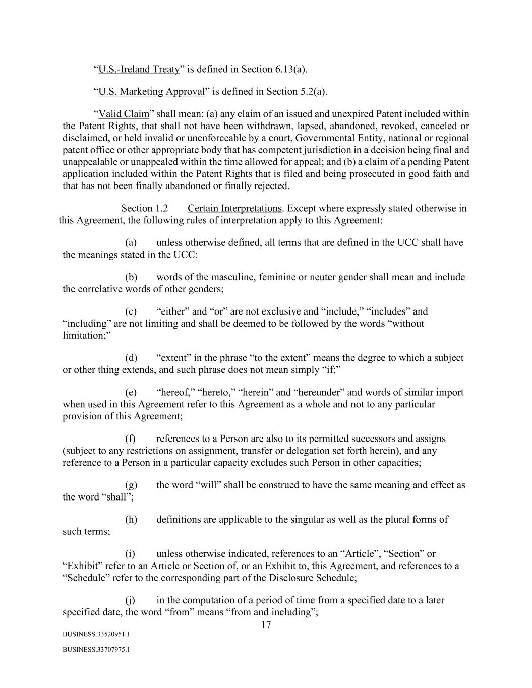17 BUSINESS.33520951.1 BUSINESS.33707975.1 “U.S.-Ireland Treaty” is defined in Section 6.13(a). “U.S. Marketing Approval” is defined in Section 5.2(a). “Valid Claim” shall mean: (a) any claim of an issued and unexpired Patent included within the Patent Rights, that shall not have been withdrawn, lapsed, abandoned, revoked, canceled or disclaimed, or held invalid or unenforceable by a court, Governmental Entity, national or regional patent office or other appropriate body that has competent jurisdiction in a decision being final and unappealable or unappealed within the time allowed for appeal; and (b) a claim of a pending Patent application included within the Patent Rights that is filed and being prosecuted in good faith and that has not been finally abandoned or finally rejected. Section 1.2 Certain Interpretations. Except where expressly stated otherwise in this Agreement, the following rules of interpretation apply to this Agreement: (a) unless otherwise defined, all terms that are defined in the UCC shall have the meanings stated in the UCC; (b) words of the masculine, feminine or neuter gender shall mean and include the correlative words of other genders; (c) “either” and “or” are not exclusive and “include,” “includes” and “including” are not limiting and shall be deemed to be followed by the words “without limitation;” (d) “extent” in the phrase “to the extent” means the degree to which a subject or other thing extends, and such phrase does not mean simply “if;” (e) “hereof,” “hereto,” “herein” and “hereunder” and words of similar import when used in this Agreement refer to this Agreement as a whole and not to any particular provision of this Agreement; (f) references to a Person are also to its permitted successors and assigns (subject to any restrictions on assignment, transfer or delegation set forth herein), and any reference to a Person in a particular capacity excludes such Person in other capacities; (g) the word “will” shall be construed to have the same meaning and effect as the word “shall”; (h) definitions are applicable to the singular as well as the plural forms of such terms; (i) unless otherwise indicated, references to an “Article”, “Section” or “Exhibit” refer to an Article or Section of, or an Exhibit to, this Agreement, and references to a “Schedule” refer to the corresponding part of the Disclosure Schedule; (j) in the computation of a period of time from a specified date to a later specified date, the word “from” means “from and including”;