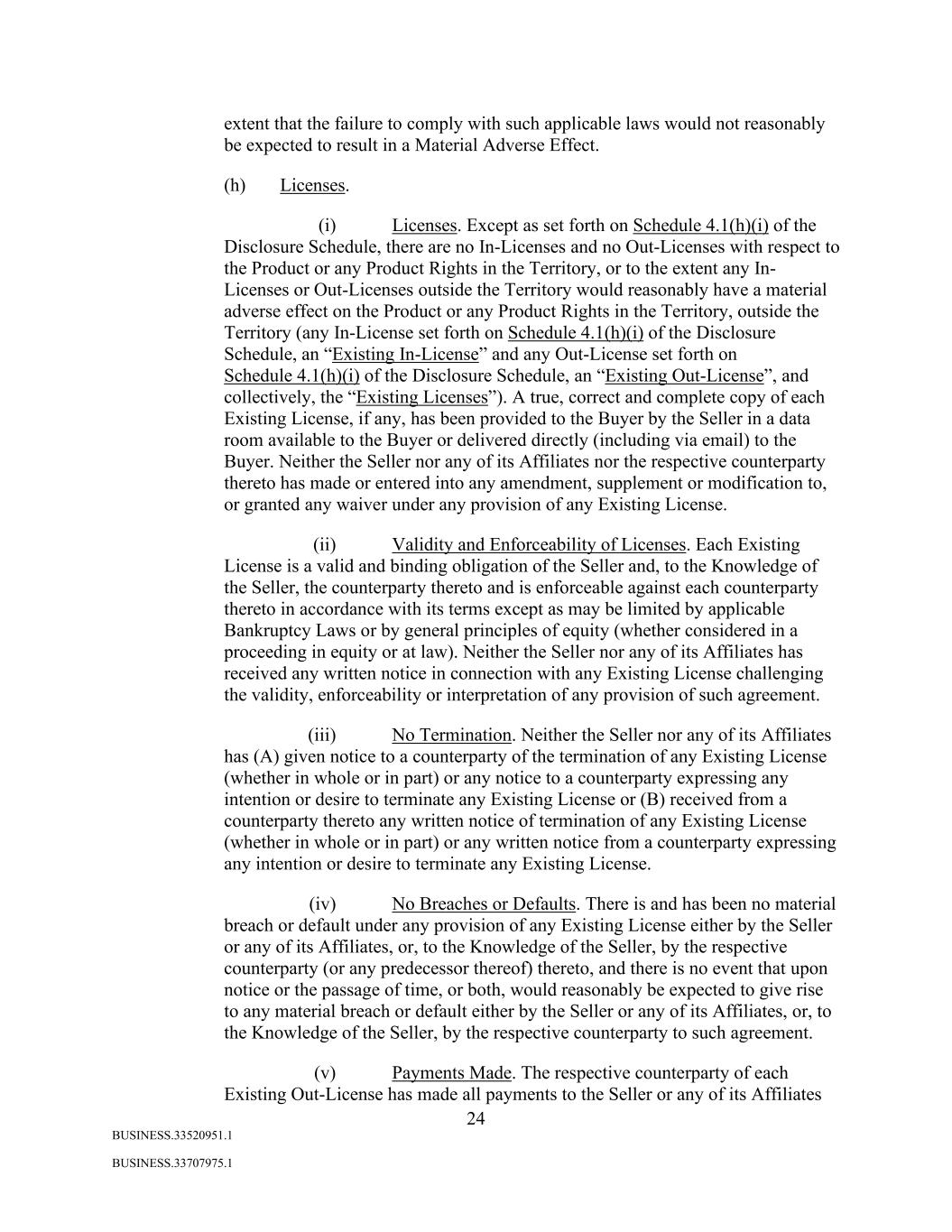 24 BUSINESS.33520951.1 BUSINESS.33707975.1 extent that the failure to comply with such applicable laws would not reasonably be expected to result in a Material Adverse Effect. (h) Licenses. (i) Licenses. Except as set forth on Schedule 4.1(h)(i) of the Disclosure Schedule, there are no In-Licenses and no Out-Licenses with respect to the Product or any Product Rights in the Territory, or to the extent any In- Licenses or Out-Licenses outside the Territory would reasonably have a material adverse effect on the Product or any Product Rights in the Territory, outside the Territory (any In-License set forth on Schedule 4.1(h)(i) of the Disclosure Schedule, an “Existing In-License” and any Out-License set forth on Schedule 4.1(h)(i) of the Disclosure Schedule, an “Existing Out-License”, and collectively, the “Existing Licenses”). A true, correct and complete copy of each Existing License, if any, has been provided to the Buyer by the Seller in a data room available to the Buyer or delivered directly (including via email) to the Buyer. Neither the Seller nor any of its Affiliates nor the respective counterparty thereto has made or entered into any amendment, supplement or modification to, or granted any waiver under any provision of any Existing License. (ii) Validity and Enforceability of Licenses. Each Existing License is a valid and binding obligation of the Seller and, to the Knowledge of the Seller, the counterparty thereto and is enforceable against each counterparty thereto in accordance with its terms except as may be limited by applicable Bankruptcy Laws or by general principles of equity (whether considered in a proceeding in equity or at law). Neither the Seller nor any of its Affiliates has received any written notice in connection with any Existing License challenging the validity, enforceability or interpretation of any provision of such agreement. (iii) No Termination. Neither the Seller nor any of its Affiliates has (A) given notice to a counterparty of the termination of any Existing License (whether in whole or in part) or any notice to a counterparty expressing any intention or desire to terminate any Existing License or (B) received from a counterparty thereto any written notice of termination of any Existing License (whether in whole or in part) or any written notice from a counterparty expressing any intention or desire to terminate any Existing License. (iv) No Breaches or Defaults. There is and has been no material breach or default under any provision of any Existing License either by the Seller or any of its Affiliates, or, to the Knowledge of the Seller, by the respective counterparty (or any predecessor thereof) thereto, and there is no event that upon notice or the passage of time, or both, would reasonably be expected to give rise to any material breach or default either by the Seller or any of its Affiliates, or, to the Knowledge of the Seller, by the respective counterparty to such agreement. (v) Payments Made. The respective counterparty of each Existing Out-License has made all payments to the Seller or any of its Affiliates