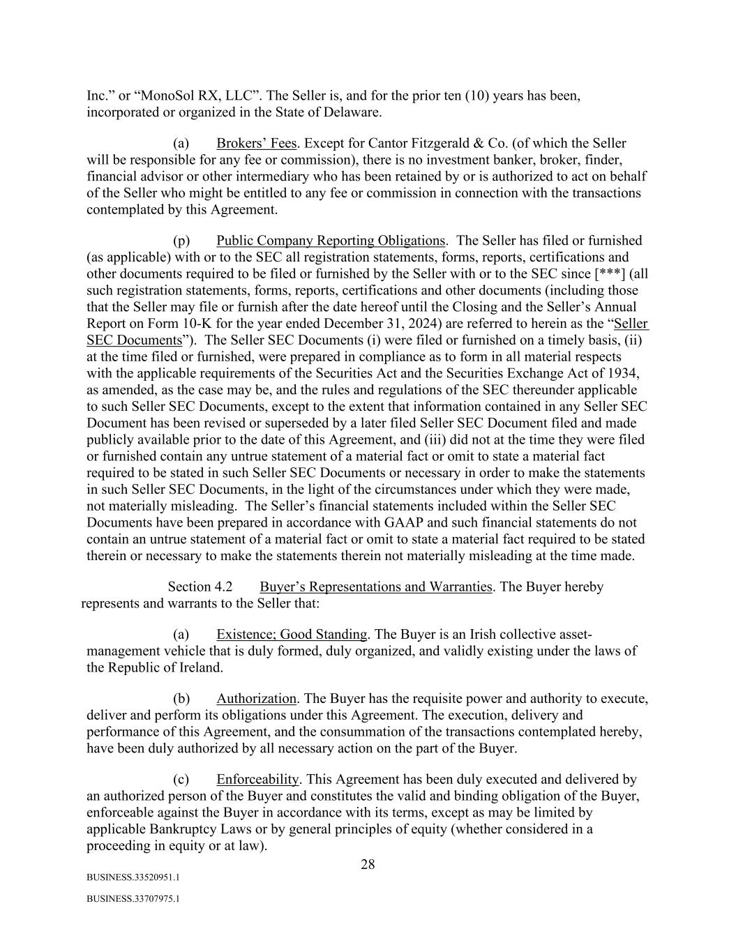 28 BUSINESS.33520951.1 BUSINESS.33707975.1 Inc.” or “MonoSol RX, LLC”. The Seller is, and for the prior ten (10) years has been, incorporated or organized in the State of Delaware. (a) Brokers’ Fees. Except for Cantor Fitzgerald & Co. (of which the Seller will be responsible for any fee or commission), there is no investment banker, broker, finder, financial advisor or other intermediary who has been retained by or is authorized to act on behalf of the Seller who might be entitled to any fee or commission in connection with the transactions contemplated by this Agreement. (p) Public Company Reporting Obligations. The Seller has filed or furnished (as applicable) with or to the SEC all registration statements, forms, reports, certifications and other documents required to be filed or furnished by the Seller with or to the SEC since [***] (all such registration statements, forms, reports, certifications and other documents (including those that the Seller may file or furnish after the date hereof until the Closing and the Seller’s Annual Report on Form 10-K for the year ended December 31, 2024) are referred to herein as the “Seller SEC Documents”). The Seller SEC Documents (i) were filed or furnished on a timely basis, (ii) at the time filed or furnished, were prepared in compliance as to form in all material respects with the applicable requirements of the Securities Act and the Securities Exchange Act of 1934, as amended, as the case may be, and the rules and regulations of the SEC thereunder applicable to such Seller SEC Documents, except to the extent that information contained in any Seller SEC Document has been revised or superseded by a later filed Seller SEC Document filed and made publicly available prior to the date of this Agreement, and (iii) did not at the time they were filed or furnished contain any untrue statement of a material fact or omit to state a material fact required to be stated in such Seller SEC Documents or necessary in order to make the statements in such Seller SEC Documents, in the light of the circumstances under which they were made, not materially misleading. The Seller’s financial statements included within the Seller SEC Documents have been prepared in accordance with GAAP and such financial statements do not contain an untrue statement of a material fact or omit to state a material fact required to be stated therein or necessary to make the statements therein not materially misleading at the time made. Section 4.2 Buyer’s Representations and Warranties. The Buyer hereby represents and warrants to the Seller that: (a) Existence; Good Standing. The Buyer is an Irish collective asset- management vehicle that is duly formed, duly organized, and validly existing under the laws of the Republic of Ireland. (b) Authorization. The Buyer has the requisite power and authority to execute, deliver and perform its obligations under this Agreement. The execution, delivery and performance of this Agreement, and the consummation of the transactions contemplated hereby, have been duly authorized by all necessary action on the part of the Buyer. (c) Enforceability. This Agreement has been duly executed and delivered by an authorized person of the Buyer and constitutes the valid and binding obligation of the Buyer, enforceable against the Buyer in accordance with its terms, except as may be limited by applicable Bankruptcy Laws or by general principles of equity (whether considered in a proceeding in equity or at law).