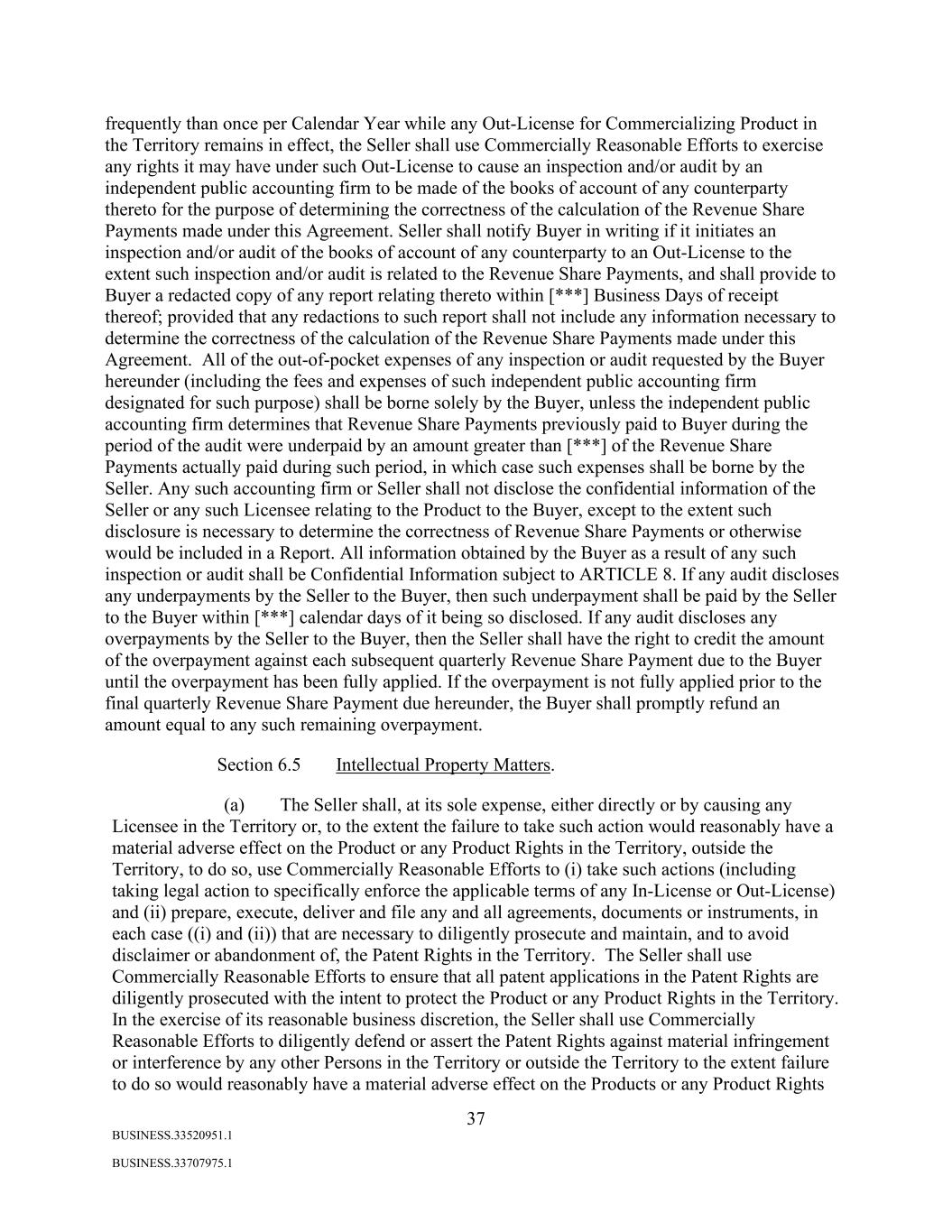 37 BUSINESS.33520951.1 BUSINESS.33707975.1 frequently than once per Calendar Year while any Out-License for Commercializing Product in the Territory remains in effect, the Seller shall use Commercially Reasonable Efforts to exercise any rights it may have under such Out-License to cause an inspection and/or audit by an independent public accounting firm to be made of the books of account of any counterparty thereto for the purpose of determining the correctness of the calculation of the Revenue Share Payments made under this Agreement. Seller shall notify Buyer in writing if it initiates an inspection and/or audit of the books of account of any counterparty to an Out-License to the extent such inspection and/or audit is related to the Revenue Share Payments, and shall provide to Buyer a redacted copy of any report relating thereto within [***] Business Days of receipt thereof; provided that any redactions to such report shall not include any information necessary to determine the correctness of the calculation of the Revenue Share Payments made under this Agreement. All of the out-of-pocket expenses of any inspection or audit requested by the Buyer hereunder (including the fees and expenses of such independent public accounting firm designated for such purpose) shall be borne solely by the Buyer, unless the independent public accounting firm determines that Revenue Share Payments previously paid to Buyer during the period of the audit were underpaid by an amount greater than [***] of the Revenue Share Payments actually paid during such period, in which case such expenses shall be borne by the Seller. Any such accounting firm or Seller shall not disclose the confidential information of the Seller or any such Licensee relating to the Product to the Buyer, except to the extent such disclosure is necessary to determine the correctness of Revenue Share Payments or otherwise would be included in a Report. All information obtained by the Buyer as a result of any such inspection or audit shall be Confidential Information subject to ARTICLE 8. If any audit discloses any underpayments by the Seller to the Buyer, then such underpayment shall be paid by the Seller to the Buyer within [***] calendar days of it being so disclosed. If any audit discloses any overpayments by the Seller to the Buyer, then the Seller shall have the right to credit the amount of the overpayment against each subsequent quarterly Revenue Share Payment due to the Buyer until the overpayment has been fully applied. If the overpayment is not fully applied prior to the final quarterly Revenue Share Payment due hereunder, the Buyer shall promptly refund an amount equal to any such remaining overpayment. Section 6.5 Intellectual Property Matters. (a) The Seller shall, at its sole expense, either directly or by causing any Licensee in the Territory or, to the extent the failure to take such action would reasonably have a material adverse effect on the Product or any Product Rights in the Territory, outside the Territory, to do so, use Commercially Reasonable Efforts to (i) take such actions (including taking legal action to specifically enforce the applicable terms of any In-License or Out-License) and (ii) prepare, execute, deliver and file any and all agreements, documents or instruments, in each case ((i) and (ii)) that are necessary to diligently prosecute and maintain, and to avoid disclaimer or abandonment of, the Patent Rights in the Territory. The Seller shall use Commercially Reasonable Efforts to ensure that all patent applications in the Patent Rights are diligently prosecuted with the intent to protect the Product or any Product Rights in the Territory. In the exercise of its reasonable business discretion, the Seller shall use Commercially Reasonable Efforts to diligently defend or assert the Patent Rights against material infringement or interference by any other Persons in the Territory or outside the Territory to the extent failure to do so would reasonably have a material adverse effect on the Products or any Product Rights