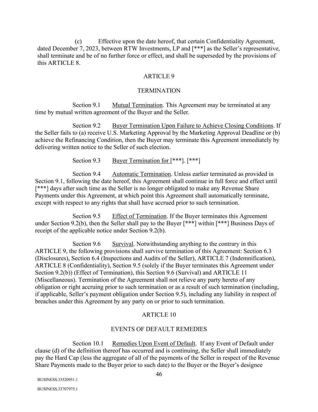46 BUSINESS.33520951.1 BUSINESS.33707975.1 (c) Effective upon the date hereof, that certain Confidentiality Agreement, dated December 7, 2023, between RTW Investments, LP and [***] as the Seller’s representative, shall terminate and be of no further force or effect, and shall be superseded by the provisions of this ARTICLE 8. ARTICLE 9 TERMINATION Section 9.1 Mutual Termination. This Agreement may be terminated at any time by mutual written agreement of the Buyer and the Seller. Section 9.2 Buyer Termination Upon Failure to Achieve Closing Conditions. If the Seller fails to (a) receive U.S. Marketing Approval by the Marketing Approval Deadline or (b) achieve the Refinancing Condition, then the Buyer may terminate this Agreement immediately by delivering written notice to the Seller of such election. Section 9.3 Buyer Termination for [***]. [***] Section 9.4 Automatic Termination. Unless earlier terminated as provided in Section 9.1, following the date hereof, this Agreement shall continue in full force and effect until [***] days after such time as the Seller is no longer obligated to make any Revenue Share Payments under this Agreement, at which point this Agreement shall automatically terminate, except with respect to any rights that shall have accrued prior to such termination. Section 9.5 Effect of Termination. If the Buyer terminates this Agreement under Section 9.2(b), then the Seller shall pay to the Buyer [***] within [***] Business Days of receipt of the applicable notice under Section 9.2(b). Section 9.6 Survival. Notwithstanding anything to the contrary in this ARTICLE 9, the following provisions shall survive termination of this Agreement: Section 6.3 (Disclosures), Section 6.4 (Inspections and Audits of the Seller), ARTICLE 7 (Indemnification), ARTICLE 8 (Confidentiality), Section 9.5 (solely if the Buyer terminates this Agreement under Section 9.2(b)) (Effect of Termination), this Section 9.6 (Survival) and ARTICLE 11 (Miscellaneous). Termination of the Agreement shall not relieve any party hereto of any obligation or right accruing prior to such termination or as a result of such termination (including, if applicable, Seller’s payment obligation under Section 9.5), including any liability in respect of breaches under this Agreement by any party on or prior to such termination. ARTICLE 10 EVENTS OF DEFAULT REMEDIES Section 10.1 Remedies Upon Event of Default. If any Event of Default under clause (d) of the definition thereof has occurred and is continuing, the Seller shall immediately pay the Hard Cap (less the aggregate of all of the payments of the Seller in respect of the Revenue Share Payments made to the Buyer prior to such date) to the Buyer or the Buyer’s designee