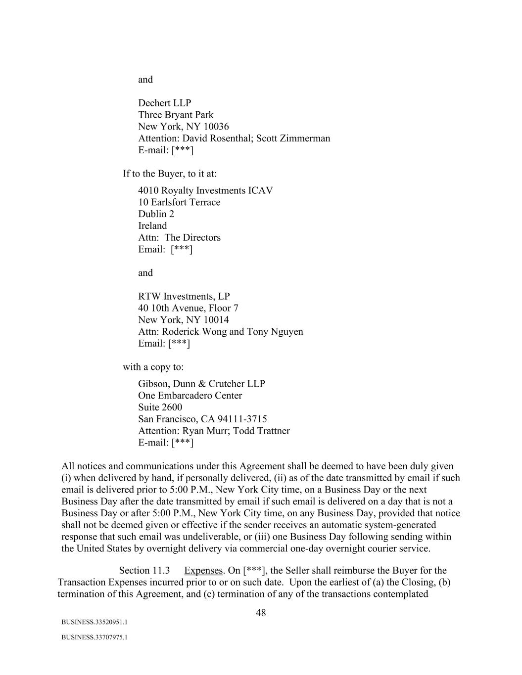48 BUSINESS.33520951.1 BUSINESS.33707975.1 and Dechert LLP Three Bryant Park New York, NY 10036 Attention: David Rosenthal; Scott Zimmerman E-mail: [***] If to the Buyer, to it at: 4010 Royalty Investments ICAV 10 Earlsfort Terrace Dublin 2 Ireland Attn: The Directors Email: [***] and RTW Investments, LP 40 10th Avenue, Floor 7 New York, NY 10014 Attn: Roderick Wong and Tony Nguyen Email: [***] with a copy to: Gibson, Dunn & Crutcher LLP One Embarcadero Center Suite 2600 San Francisco, CA 94111-3715 Attention: Ryan Murr; Todd Trattner E-mail: [***] All notices and communications under this Agreement shall be deemed to have been duly given (i) when delivered by hand, if personally delivered, (ii) as of the date transmitted by email if such email is delivered prior to 5:00 P.M., New York City time, on a Business Day or the next Business Day after the date transmitted by email if such email is delivered on a day that is not a Business Day or after 5:00 P.M., New York City time, on any Business Day, provided that notice shall not be deemed given or effective if the sender receives an automatic system-generated response that such email was undeliverable, or (iii) one Business Day following sending within the United States by overnight delivery via commercial one-day overnight courier service. Section 11.3 Expenses. On [***], the Seller shall reimburse the Buyer for the Transaction Expenses incurred prior to or on such date. Upon the earliest of (a) the Closing, (b) termination of this Agreement, and (c) termination of any of the transactions contemplated