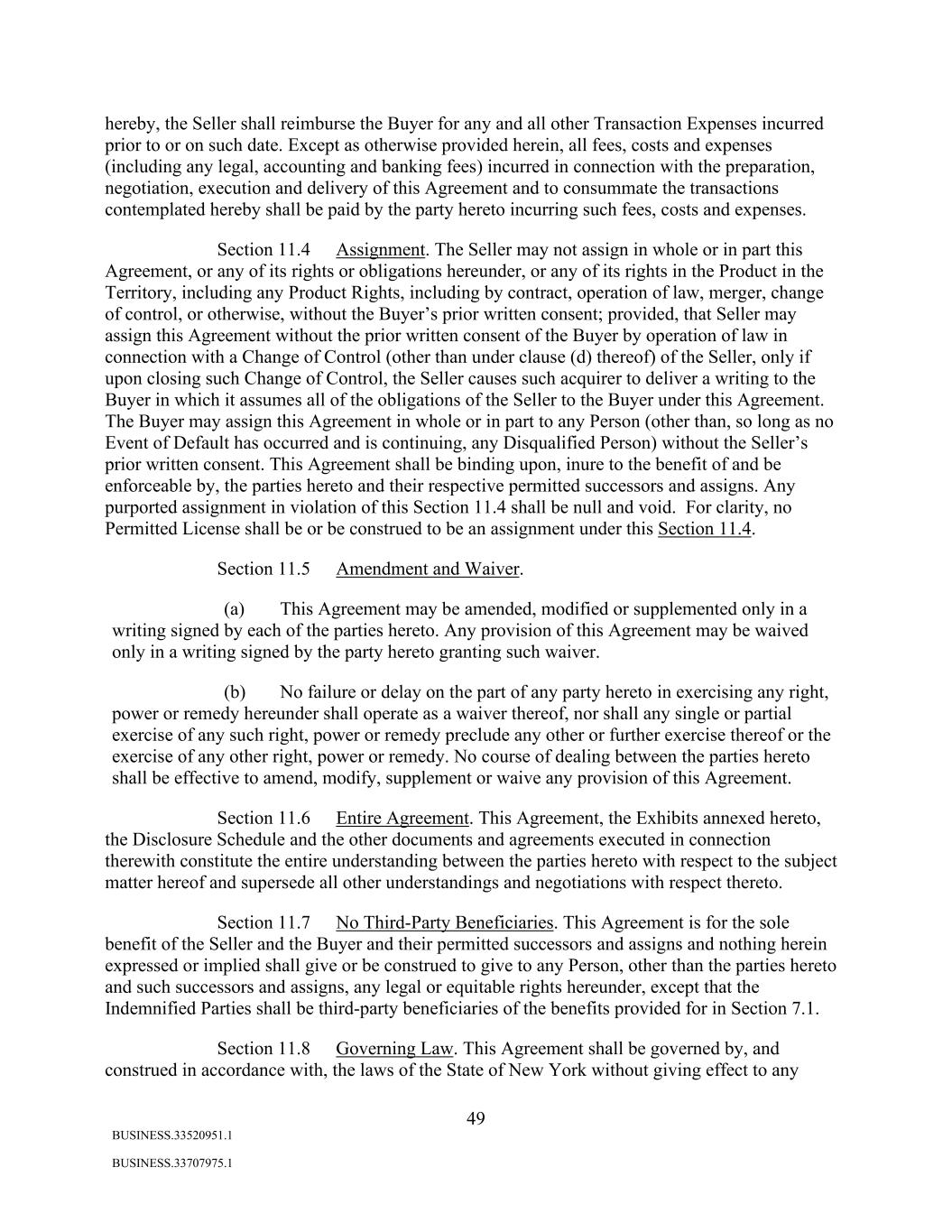 49 BUSINESS.33520951.1 BUSINESS.33707975.1 hereby, the Seller shall reimburse the Buyer for any and all other Transaction Expenses incurred prior to or on such date. Except as otherwise provided herein, all fees, costs and expenses (including any legal, accounting and banking fees) incurred in connection with the preparation, negotiation, execution and delivery of this Agreement and to consummate the transactions contemplated hereby shall be paid by the party hereto incurring such fees, costs and expenses. Section 11.4 Assignment. The Seller may not assign in whole or in part this Agreement, or any of its rights or obligations hereunder, or any of its rights in the Product in the Territory, including any Product Rights, including by contract, operation of law, merger, change of control, or otherwise, without the Buyer’s prior written consent; provided, that Seller may assign this Agreement without the prior written consent of the Buyer by operation of law in connection with a Change of Control (other than under clause (d) thereof) of the Seller, only if upon closing such Change of Control, the Seller causes such acquirer to deliver a writing to the Buyer in which it assumes all of the obligations of the Seller to the Buyer under this Agreement. The Buyer may assign this Agreement in whole or in part to any Person (other than, so long as no Event of Default has occurred and is continuing, any Disqualified Person) without the Seller’s prior written consent. This Agreement shall be binding upon, inure to the benefit of and be enforceable by, the parties hereto and their respective permitted successors and assigns. Any purported assignment in violation of this Section 11.4 shall be null and void. For clarity, no Permitted License shall be or be construed to be an assignment under this Section 11.4. Section 11.5 Amendment and Waiver. (a) This Agreement may be amended, modified or supplemented only in a writing signed by each of the parties hereto. Any provision of this Agreement may be waived only in a writing signed by the party hereto granting such waiver. (b) No failure or delay on the part of any party hereto in exercising any right, power or remedy hereunder shall operate as a waiver thereof, nor shall any single or partial exercise of any such right, power or remedy preclude any other or further exercise thereof or the exercise of any other right, power or remedy. No course of dealing between the parties hereto shall be effective to amend, modify, supplement or waive any provision of this Agreement. Section 11.6 Entire Agreement. This Agreement, the Exhibits annexed hereto, the Disclosure Schedule and the other documents and agreements executed in connection therewith constitute the entire understanding between the parties hereto with respect to the subject matter hereof and supersede all other understandings and negotiations with respect thereto. Section 11.7 No Third-Party Beneficiaries. This Agreement is for the sole benefit of the Seller and the Buyer and their permitted successors and assigns and nothing herein expressed or implied shall give or be construed to give to any Person, other than the parties hereto and such successors and assigns, any legal or equitable rights hereunder, except that the Indemnified Parties shall be third-party beneficiaries of the benefits provided for in Section 7.1. Section 11.8 Governing Law. This Agreement shall be governed by, and construed in accordance with, the laws of the State of New York without giving effect to any