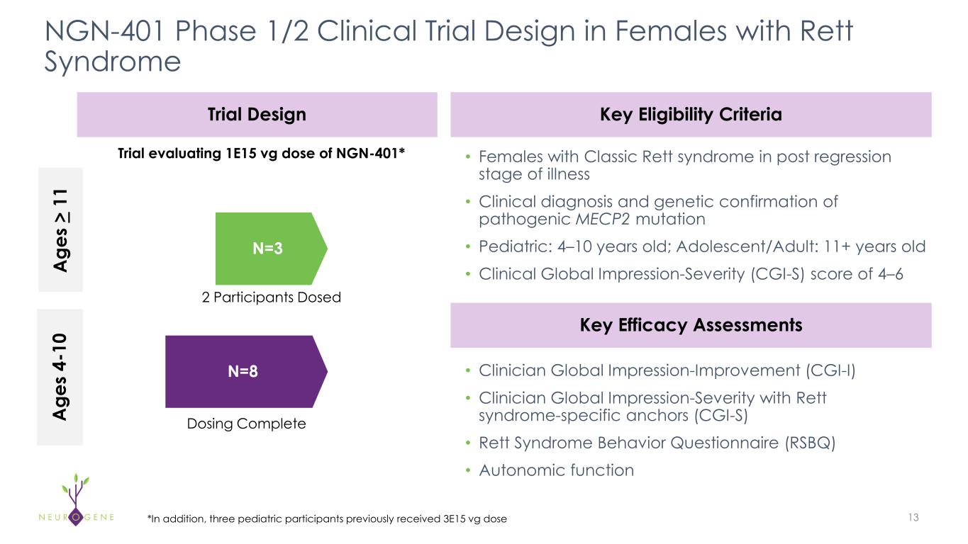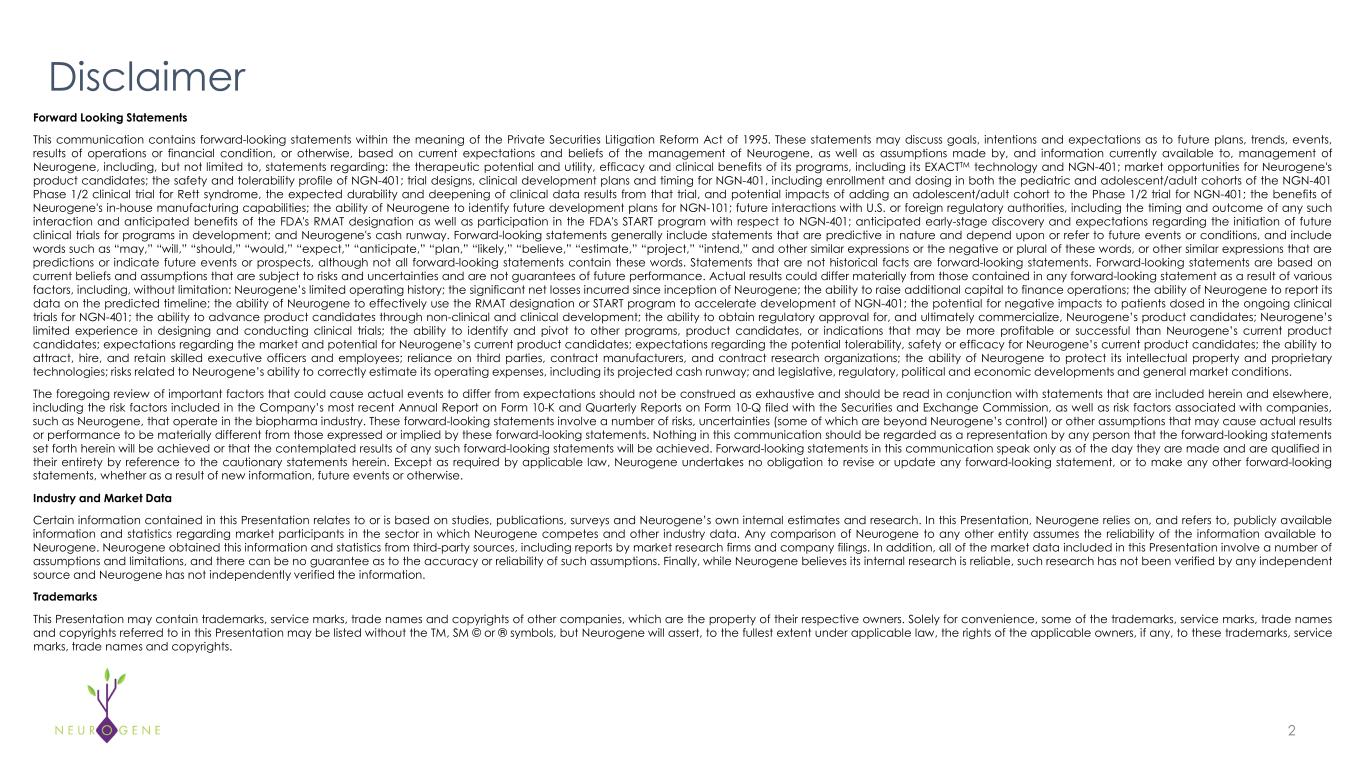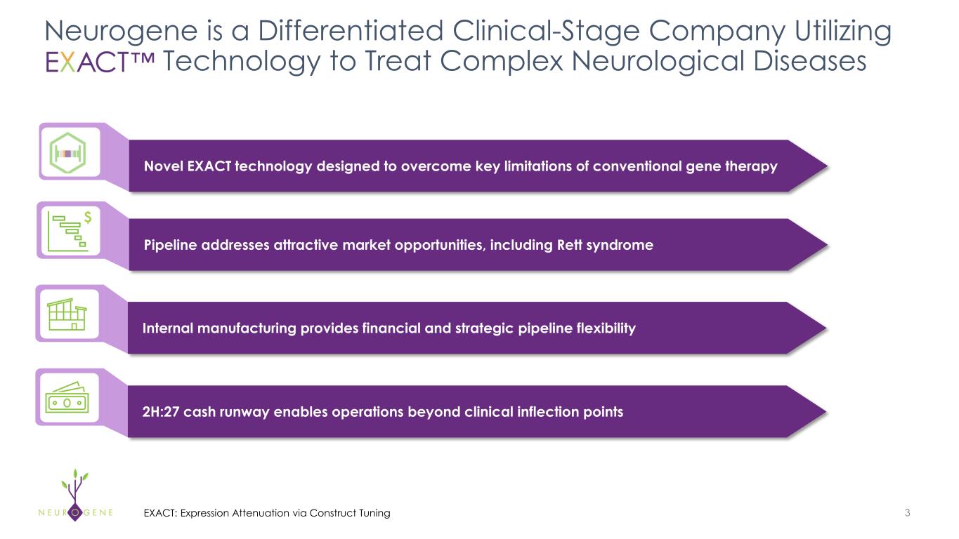 2 Disclaimer Forward Looking Statements This communication contains forward-looking statements within the meaning of the Private Securities Litigation Reform Act of 1995. These statements may discuss goals, intentions and expectations as to future plans, trends, events, results of operations or financial condition, or otherwise, based on current expectations and beliefs of the management of Neurogene, as well as assumptions made by, and information currently available to, management of Neurogene, including, but not limited to, statements regarding: the therapeutic potential and utility, efficacy and clinical benefits of its programs, including its EXACTTM technology and NGN-401; market opportunities for Neurogene's product candidates; the safety and tolerability profile of NGN-401; trial designs, clinical development plans and timing for NGN-401, including enrollment and dosing in both the pediatric and adolescent/adult cohorts of the NGN-401 Phase 1/2 clinical trial for Rett syndrome, the expected durability and deepening of clinical data results from that trial, and potential impacts of adding an adolescent/adult cohort to the Phase 1/2 trial for NGN-401; the benefits of Neurogene's in-house manufacturing capabilities; the ability of Neurogene to identify future development plans for NGN-101; future interactions with U.S. or foreign regulatory authorities, including the timing and outcome of any such interaction and anticipated benefits of the FDA's RMAT designation as well as participation in the FDA's START program with respect to NGN-401; anticipated early-stage discovery and expectations regarding the initiation of future clinical trials for programs in development; and Neurogene's cash runway. Forward-looking statements generally include statements that are predictive in nature and depend upon or refer to future events or conditions, and include words such as “may,” “will,” “should,” “would,” “expect,” “anticipate,” “plan,” “likely,” “believe,” “estimate,” “project,” “intend,” and other similar expressions or the negative or plural of these words, or other similar expressions that are predictions or indicate future events or prospects, although not all forward-looking statements contain these words. Statements that are not historical facts are forward-looking statements. Forward-looking statements are based on current beliefs and assumptions that are subject to risks and uncertainties and are not guarantees of future performance. Actual results could differ materially from those contained in any forward-looking statement as a result of various factors, including, without limitation: Neurogene’s limited operating history; the significant net losses incurred since inception of Neurogene; the ability to raise additional capital to finance operations; the ability of Neurogene to report its data on the predicted timeline; the ability of Neurogene to effectively use the RMAT designation or START program to accelerate development of NGN-401; the potential for negative impacts to patients dosed in the ongoing clinical trials for NGN-401; the ability to advance product candidates through non-clinical and clinical development; the ability to obtain regulatory approval for, and ultimately commercialize, Neurogene’s product candidates; Neurogene’s limited experience in designing and conducting clinical trials; the ability to identify and pivot to other programs, product candidates, or indications that may be more profitable or successful than Neurogene’s current product candidates; expectations regarding the market and potential for Neurogene’s current product candidates; expectations regarding the potential tolerability, safety or efficacy for Neurogene’s current product candidates; the ability to attract, hire, and retain skilled executive officers and employees; reliance on third parties, contract manufacturers, and contract research organizations; the ability of Neurogene to protect its intellectual property and proprietary technologies; risks related to Neurogene’s ability to correctly estimate its operating expenses, including its projected cash runway; and legislative, regulatory, political and economic developments and general market conditions. The foregoing review of important factors that could cause actual events to differ from expectations should not be construed as exhaustive and should be read in conjunction with statements that are included herein and elsewhere, including the risk factors included in the Company’s most recent Annual Report on Form 10-K and Quarterly Reports on Form 10-Q filed with the Securities and Exchange Commission, as well as risk factors associated with companies, such as Neurogene, that operate in the biopharma industry. These forward-looking statements involve a number of risks, uncertainties (some of which are beyond Neurogene’s control) or other assumptions that may cause actual results or performance to be materially different from those expressed or implied by these forward-looking statements. Nothing in this communication should be regarded as a representation by any person that the forward-looking statements set forth herein will be achieved or that the contemplated results of any such forward-looking statements will be achieved. Forward-looking statements in this communication speak only as of the day they are made and are qualified in their entirety by reference to the cautionary statements herein. Except as required by applicable law, Neurogene undertakes no obligation to revise or update any forward-looking statement, or to make any other forward-looking statements, whether as a result of new information, future events or otherwise. Industry and Market Data Certain information contained in this Presentation relates to or is based on studies, publications, surveys and Neurogene’s own internal estimates and research. In this Presentation, Neurogene relies on, and refers to, pub