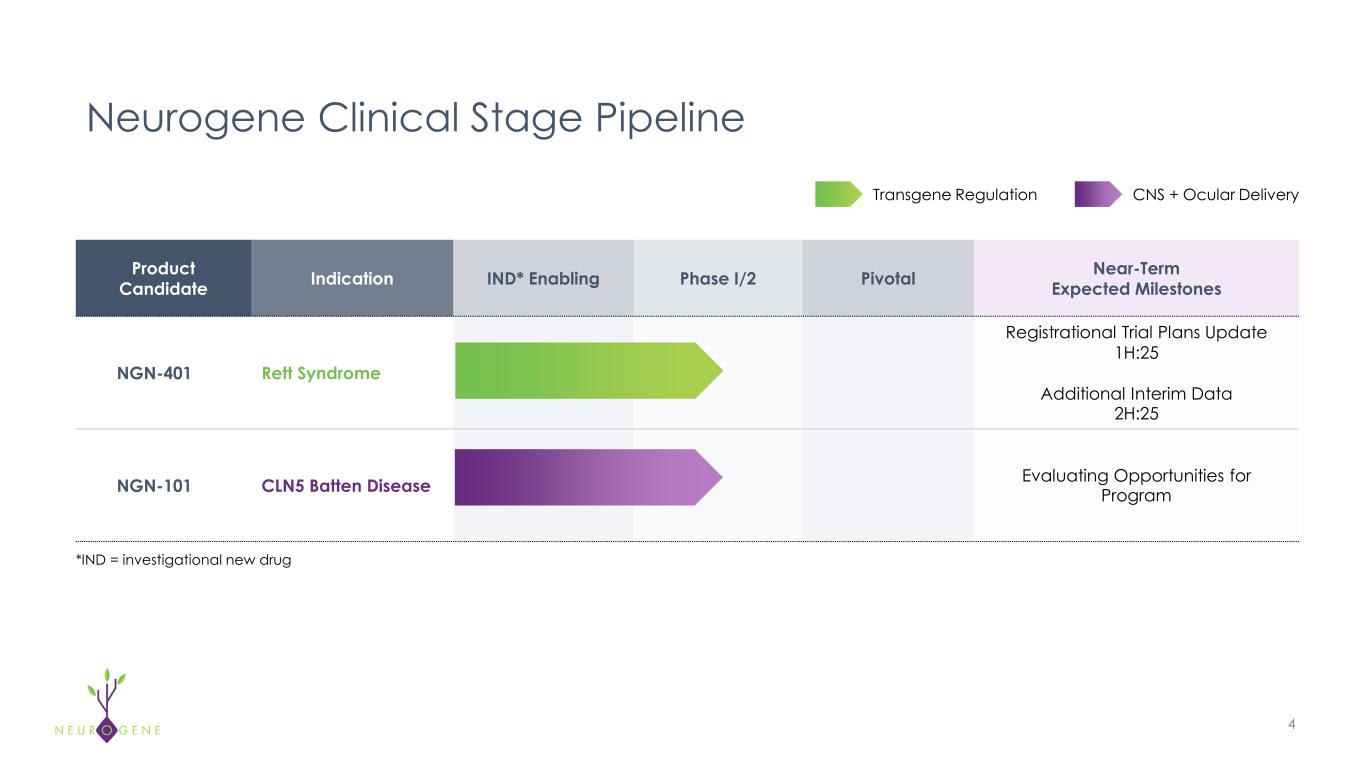 Neurogene is a Differentiated Clinical-Stage Company Utilizing EXACT Technology to Treat Complex Neurological Diseases 3 Novel EXACT technology designed to overcome key limitations of conventional gene therapy Internal manufacturing provides financial and strategic pipeline flexibility Pipeline addresses attractive market opportunities, including Rett syndrome Internal manufacturing provides financial and strategic pipeline flexibility 2H:27 cash runway enables operations beyond clinical inflection points $ EXACT: Expression Attenuation via Construct Tuning