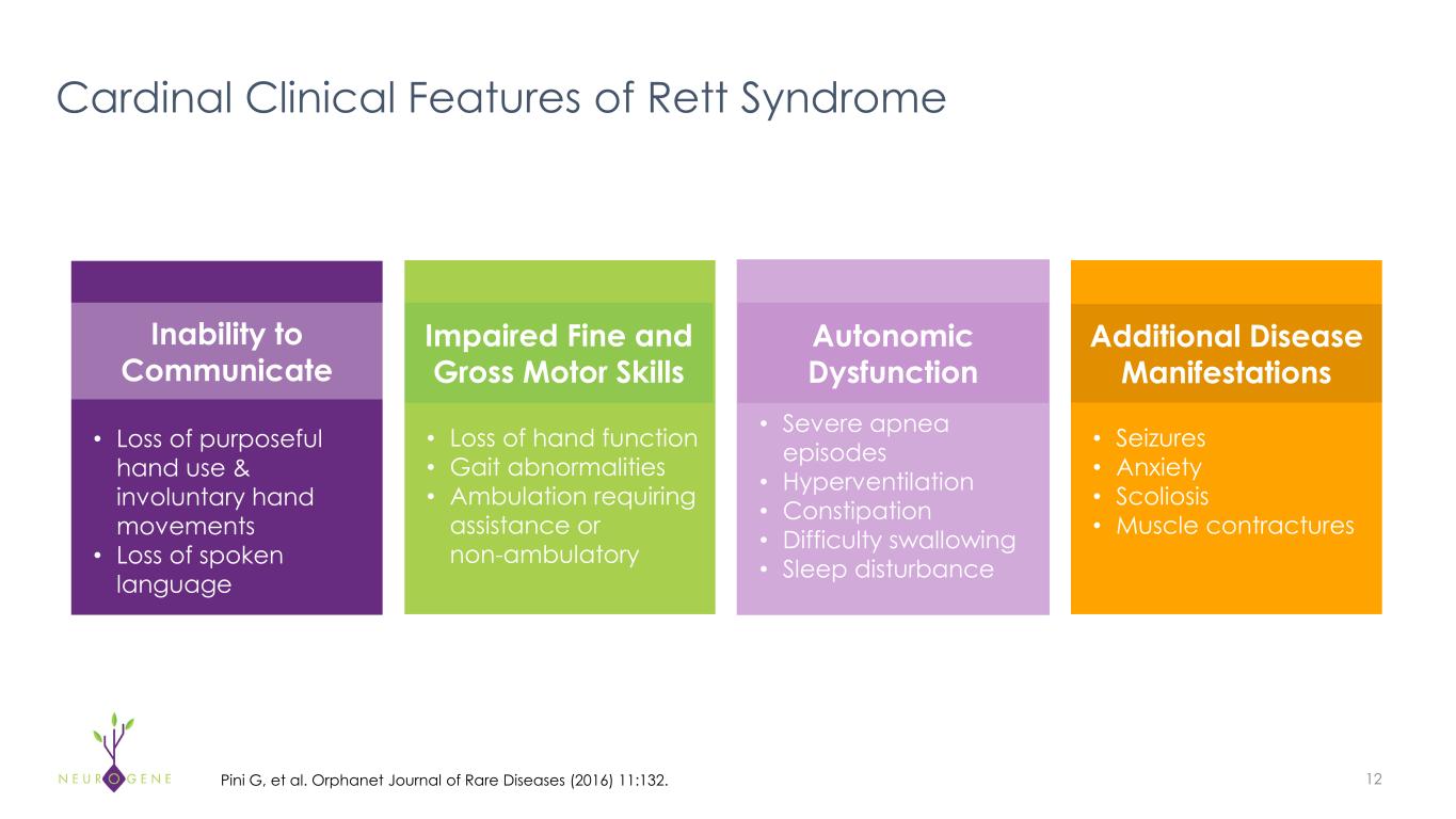 Cardinal Clinical Features of Rett Syndrome • Loss of purposeful hand use & involuntary hand movements • Loss of spoken language • Loss of hand function • Gait abnormalities • Ambulation requiring assistance or non-ambulatory • Severe apnea episodes • Hyperventilation • Constipation • Difficulty swallowing • Sleep disturbance • Seizures • Anxiety • Scoliosis • Muscle contractures Inability to Communicate Impaired Fine and Gross Motor Skills Autonomic Dysfunction Additional Disease Manifestations 12Pini G, et al. Orphanet Journal of Rare Diseases (2016) 11:132.