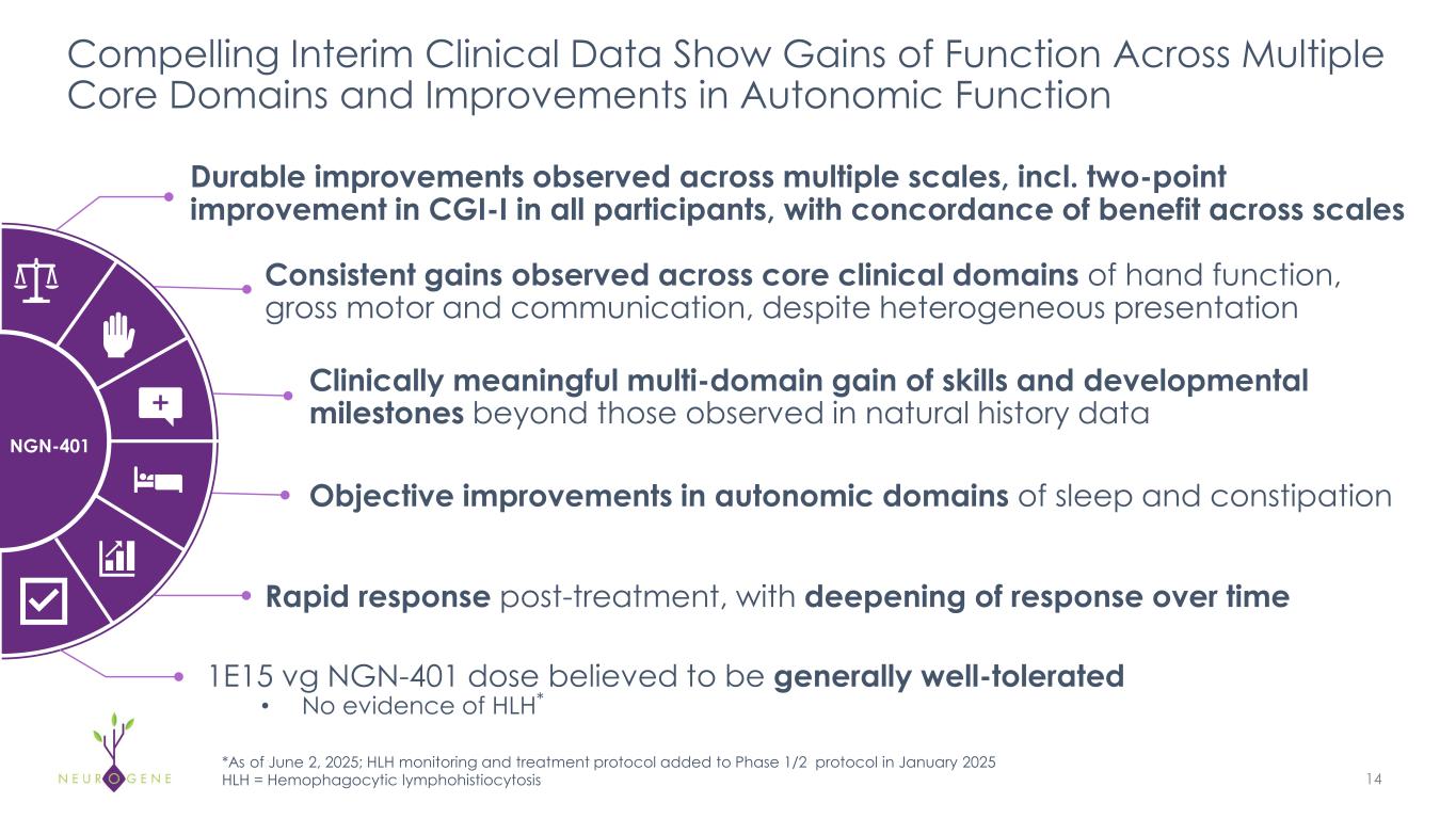 NGN-401 Phase 1/2 Clinical Trial Design in Females with Rett Syndrome 13*In addition, three pediatric participants previously received 3E15 vg dose Trial Design • Females with Classic Rett syndrome in post regression stage of illness • Clinical diagnosis and genetic confirmation of pathogenic MECP2 mutation • Pediatric: 4–10 years old; Adolescent/Adult: 11+ years old • Clinical Global Impression-Severity (CGI-S) score of 4–6 N=8 N=3 Key Eligibility Criteria • Clinician Global Impression-Improvement (CGI-I) • Clinician Global Impression-Severity with Rett syndrome-specific anchors (CGI-S) • Rett Syndrome Behavior Questionnaire (RSBQ) • Autonomic function Key Efficacy Assessments Trial evaluating 1E15 vg dose of NGN-401* A ge s 4- 10 A ge s > 11 Dosing Complete 2 Participants Dosed