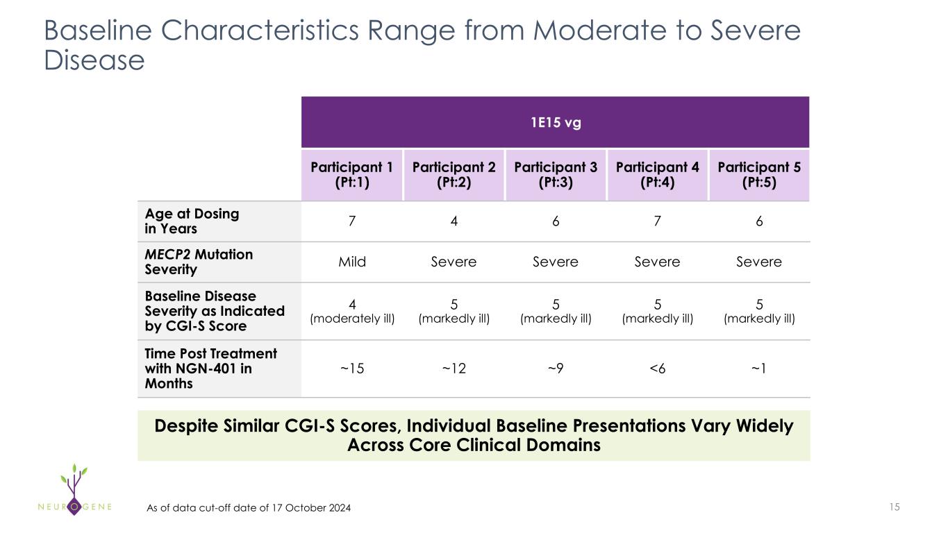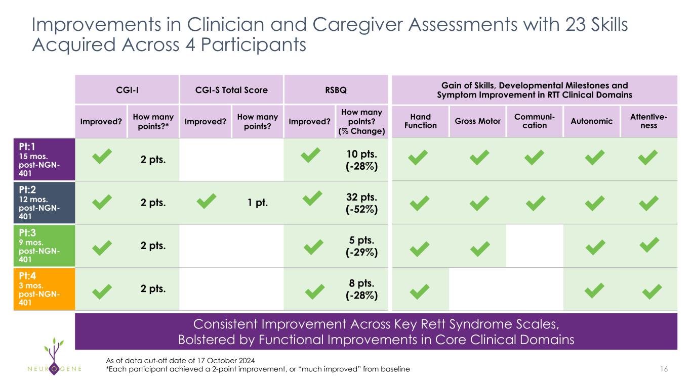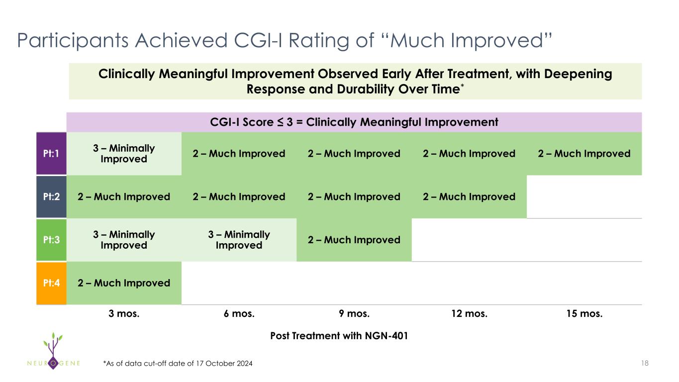 Participants Achieved CGI-I Rating of “Much Improved” CGI-I Score ≤ 3 = Clinically Meaningful Improvement Pt:1 3 – Minimally Improved 2 – Much Improved 2 – Much Improved 2 – Much Improved 2 – Much Improved Pt:2 2 – Much Improved 2 – Much Improved 2 – Much Improved 2 – Much Improved Pt:3 3 – Minimally Improved 3 – Minimally Improved 2 – Much Improved Pt:4 2 – Much Improved 3 mos. 6 mos. 9 mos. 12 mos. 15 mos. 18 Post Treatment with NGN-401 *As of data cut-off date of 17 October 2024 Clinically Meaningful Improvement Observed Early After Treatment, with Deepening Response and Durability Over Time*