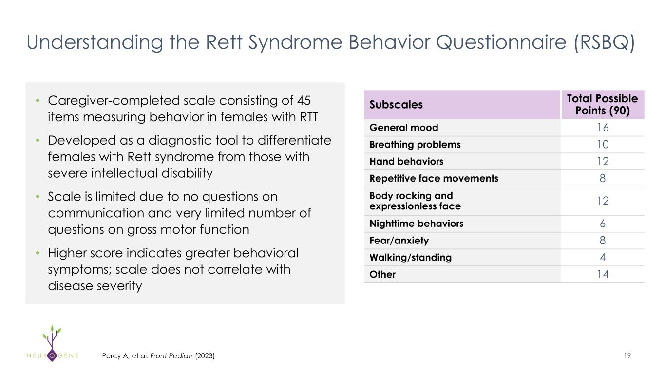 Understanding the Rett Syndrome Behavior Questionnaire (RSBQ) • Caregiver-completed scale consisting of 45 items measuring behavior in females with RTT • Developed as a diagnostic tool to differentiate females with Rett syndrome from those with severe intellectual disability • Scale is limited due to no questions on communication and very limited number of questions on gross motor function • Higher score indicates greater behavioral symptoms; scale does not correlate with disease severity 19Percy A, et al. Front Pediatr (2023) Subscales Total Possible Points (90) General mood 16 Breathing problems 10 Hand behaviors 12 Repetitive face movements 8 Body rocking and expressionless face 12 Nighttime behaviors 6 Fear/anxiety 8 Walking/standing 4 Other 14
