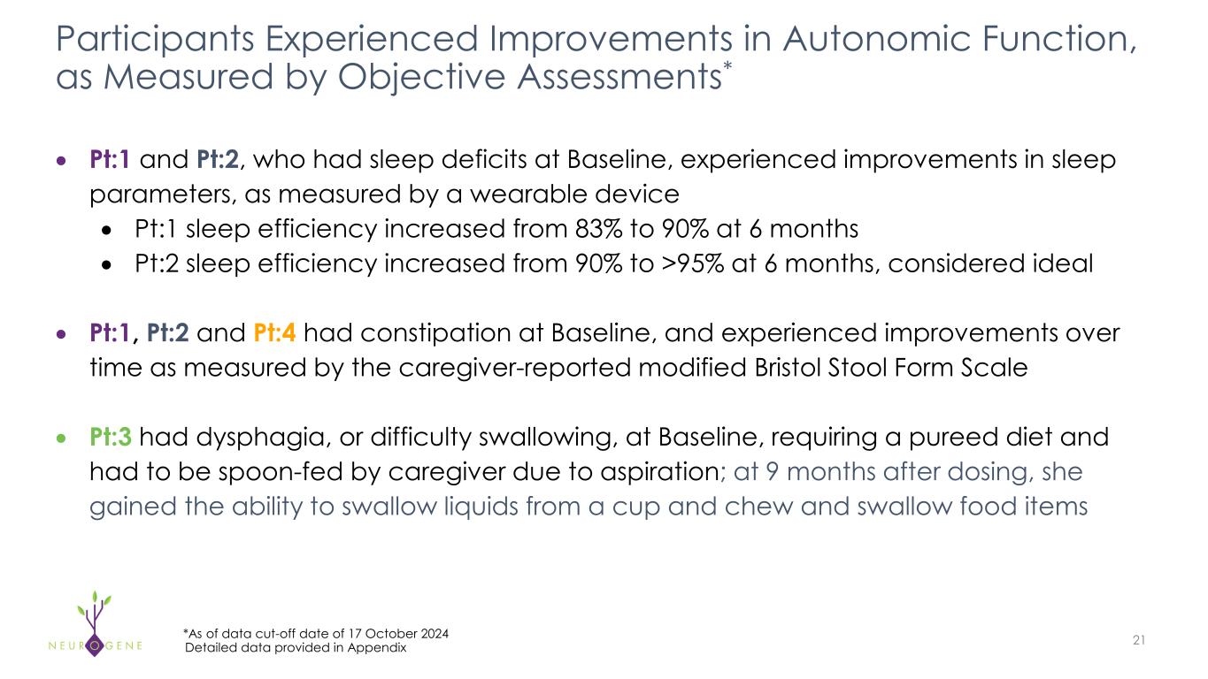 Participants Experienced Improvements in Autonomic Function, as Measured by Objective Assessments* 21Detailed data provided in Appendix • Pt:1 and Pt:2, who had sleep deficits at Baseline, experienced improvements in sleep parameters, as measured by a wearable device • Pt:1 sleep efficiency increased from 83% to 90% at 6 months • Pt:2 sleep efficiency increased from 90% to >95% at 6 months, considered ideal • Pt:1, Pt:2 and Pt:4 had constipation at Baseline, and experienced improvements over time as measured by the caregiver-reported modified Bristol Stool Form Scale • Pt:3 had dysphagia, or difficulty swallowing, at Baseline, requiring a pureed diet and had to be spoon-fed by caregiver due to aspiration; at 9 months after dosing, she gained the ability to swallow liquids from a cup and chew and swallow food items *As of data cut-off date of 17 October 2024