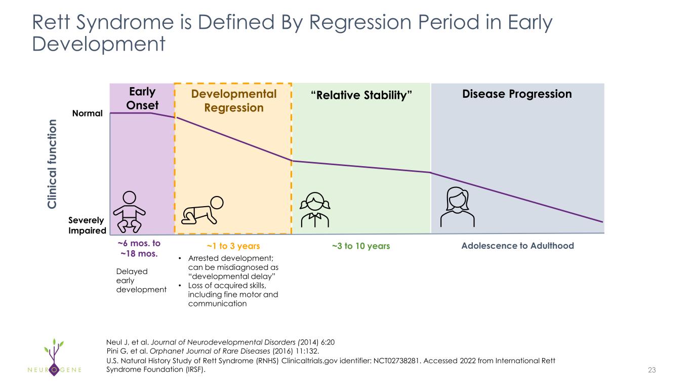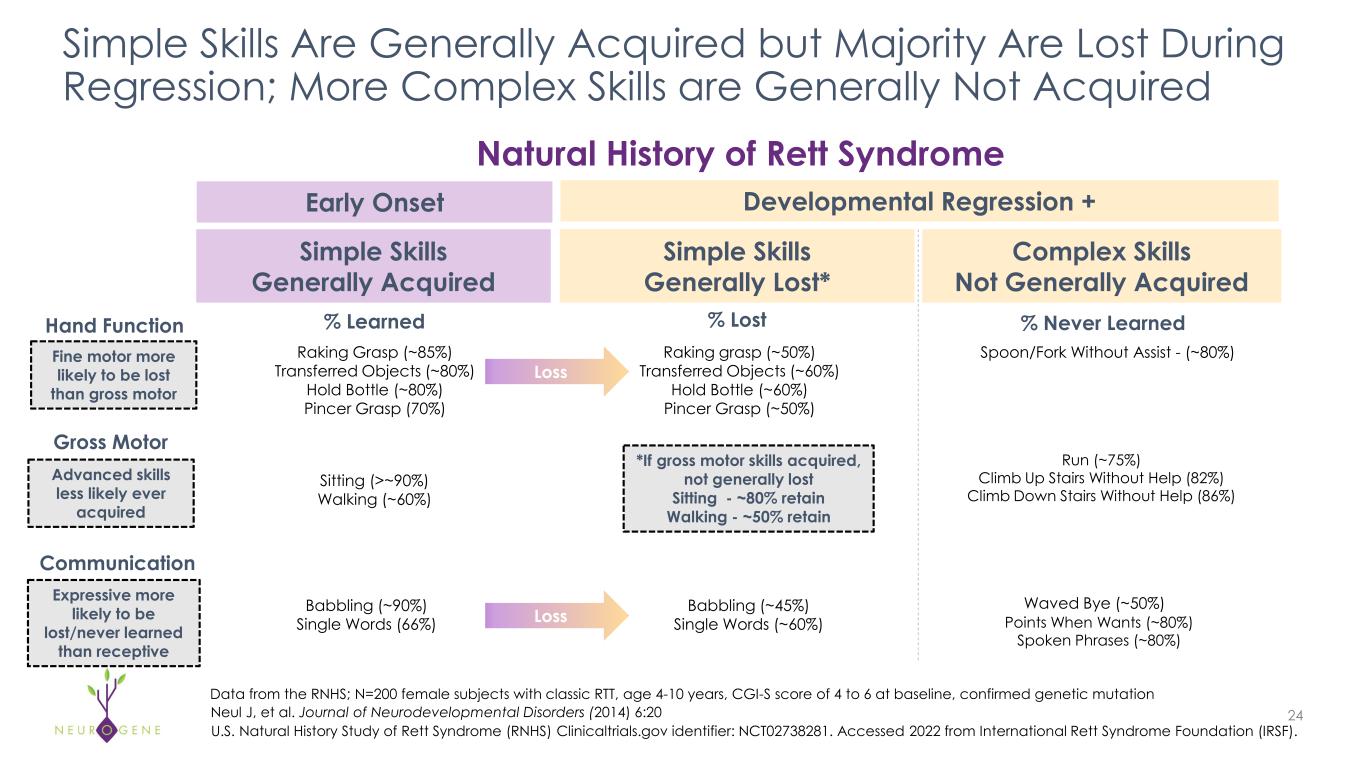 Rett Syndrome is Defined By Regression Period in Early Development 23 Pini G, et al. Orphanet Journal of Rare Diseases (2016) 11:132. C lin ic al fu nc tio n ~6 mos. to ~18 mos. ~1 to 3 years ~3 to 10 years Normal Adolescence to Adulthood Developmental Regression Early Onset Disease Progression“Relative Stability” Severely Impaired Delayed early development • Arrested development; can be misdiagnosed as “developmental delay” • Loss of acquired skills, including fine motor and communication U.S. Natural History Study of Rett Syndrome (RNHS) Clinicaltrials.gov identifier: NCT02738281. Accessed 2022 from International Rett Syndrome Foundation (IRSF). Neul J, et al. Journal of Neurodevelopmental Disorders (2014) 6:20