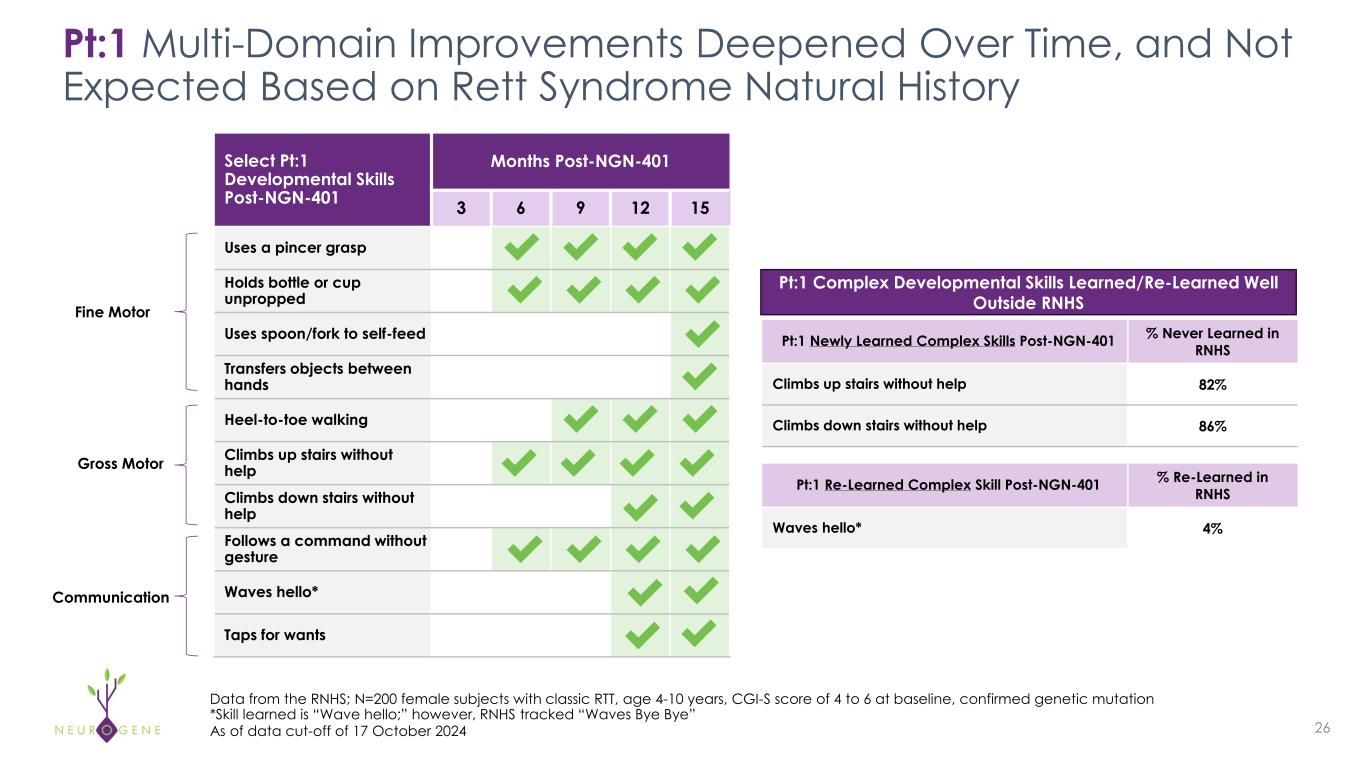Hand Function / Fine Motor • Had a raking grasp, briefly held objects, dropping items quickly, with limited ability to self-feed Ambulation / Gross Motor • Walked independently, but would stay on her tip-toes, freeze often and required a parent to help her go up/down stairs or get on/off a bed Language / Communication • Unable to indicate her wishes, follow simple commands from her parents, or express emotion Pt:1 From Pre-Treatment to 15 Months Post NGN-401 25 Baseline (7 years old) Post Treatment with NGN-401 Images are representative of skills and are not photos of participants in the NGN-401 clinical trial As of data cut-off date of 17 October 2024 • Developed a pincer grasp, able to self-feed, has begun using a fork to eat; uses both hands to drink on her own • More fluid gait with heel to toe walking, and does the following on her own: goes up/down the stairs, climbs out of high rimmed bathtub, gets on/off furniture, climbs out of her car seat to exit the car • Without being told, navigates her house to the car to go to school, waves hello to her grandfather on daily video calls, taps on food items to express choices, frowns/shouts to show displeasure • Follows >10 commands such as “give a kiss,” “sit down,” “give it to me,” “put item in trash,” “open/close door,” “flush toilet”