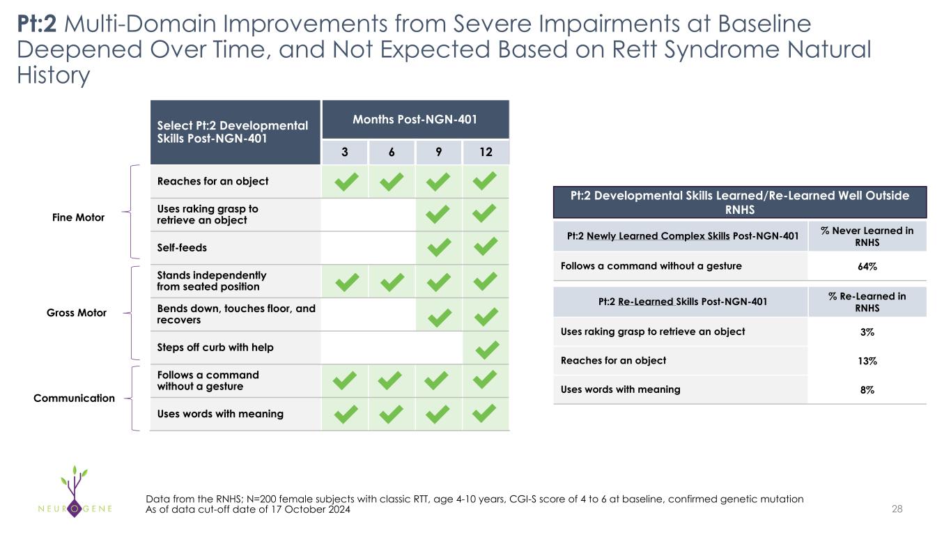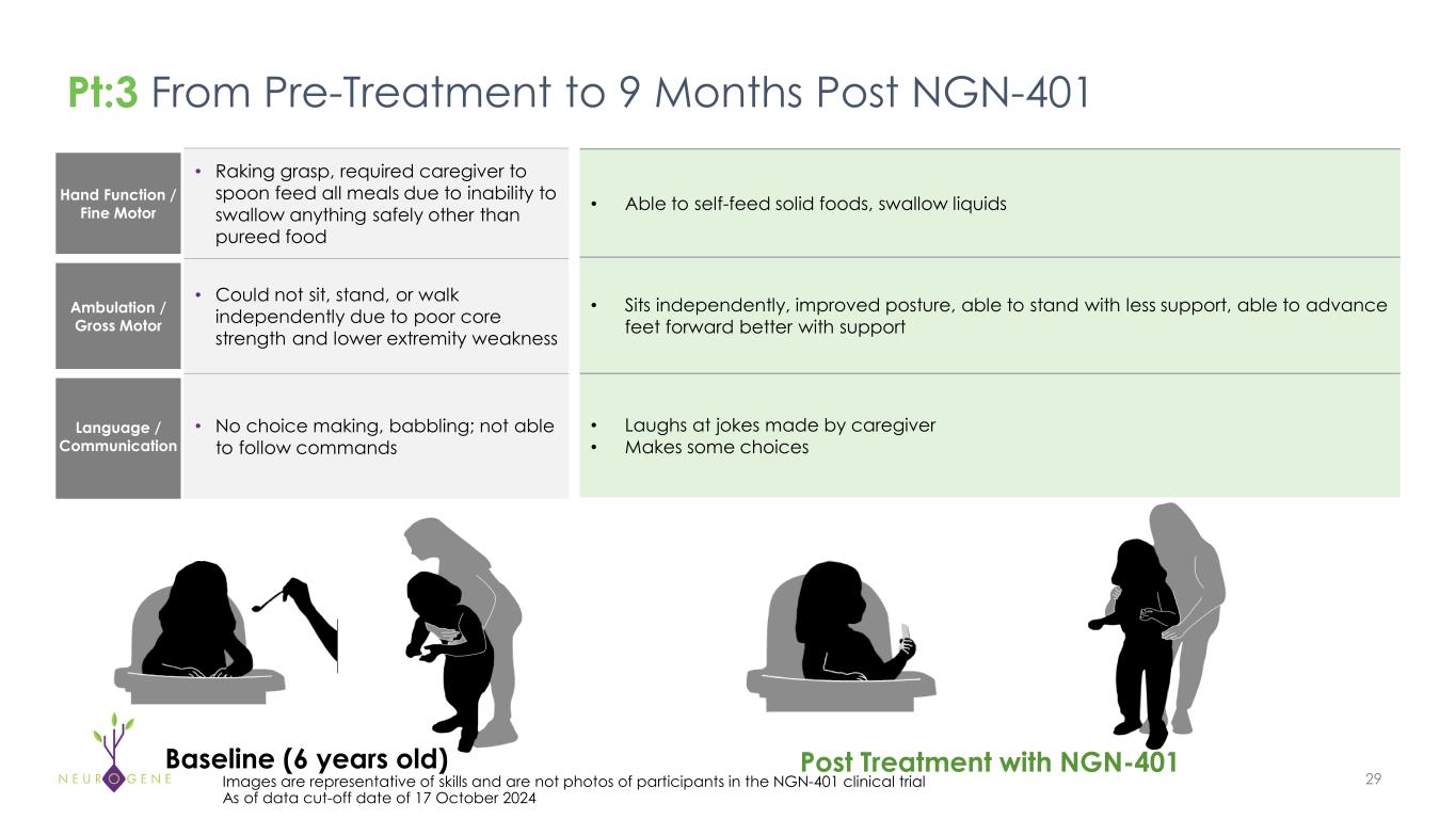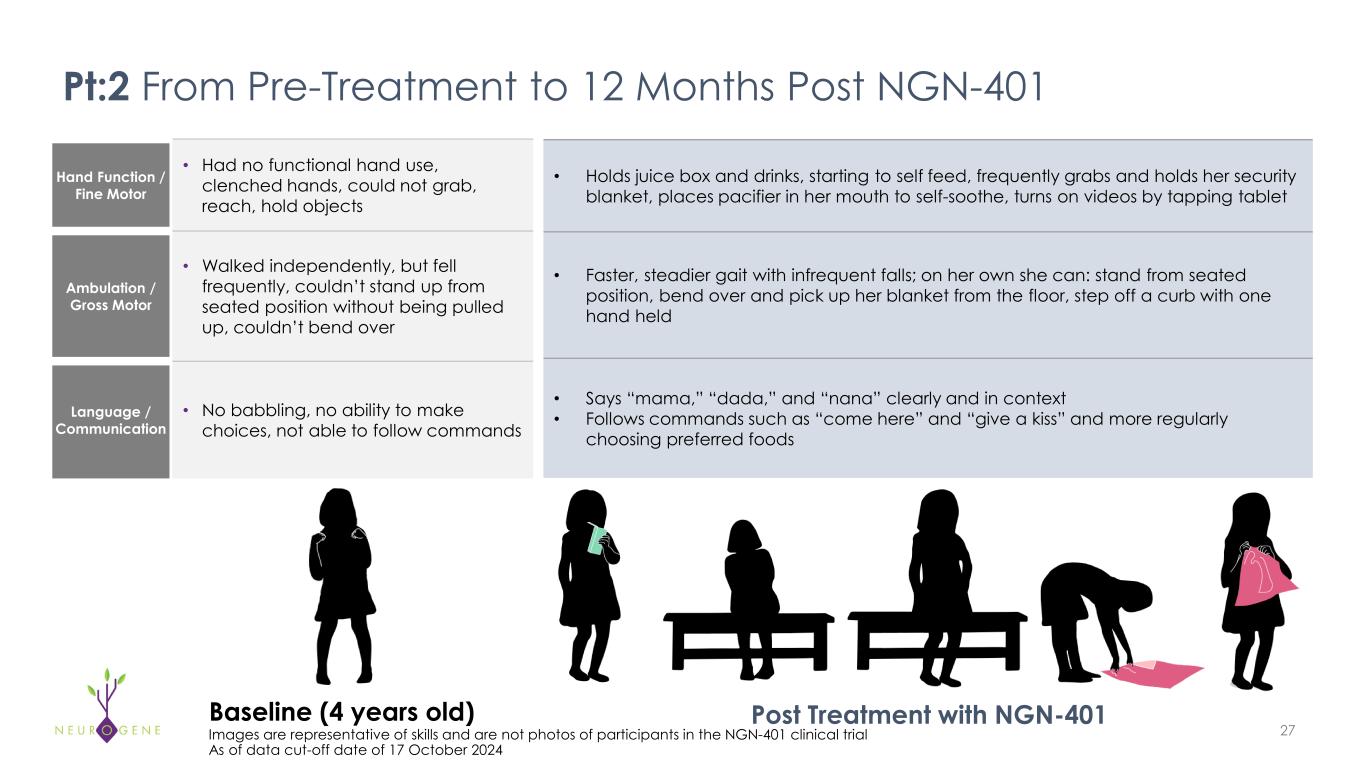 Hand Function / Fine Motor • Had no functional hand use, clenched hands, could not grab, reach, hold objects Ambulation / Gross Motor • Walked independently, but fell frequently, couldn’t stand up from seated position without being pulled up, couldn’t bend over Language / Communication • No babbling, no ability to make choices, not able to follow commands 27Images are representative of skills and are not photos of participants in the NGN-401 clinical trial As of data cut-off date of 17 October 2024 • Holds juice box and drinks, starting to self feed, frequently grabs and holds her security blanket, places pacifier in her mouth to self-soothe, turns on videos by tapping tablet • Faster, steadier gait with infrequent falls; on her own she can: stand from seated position, bend over and pick up her blanket from the floor, step off a curb with one hand held • Says “mama,” “dada,” and “nana” clearly and in context • Follows commands such as “come here” and “give a kiss” and more regularly choosing preferred foods Pt:2 From Pre-Treatment to 12 Months Post NGN-401 Post Treatment with NGN-401Baseline (4 years old)