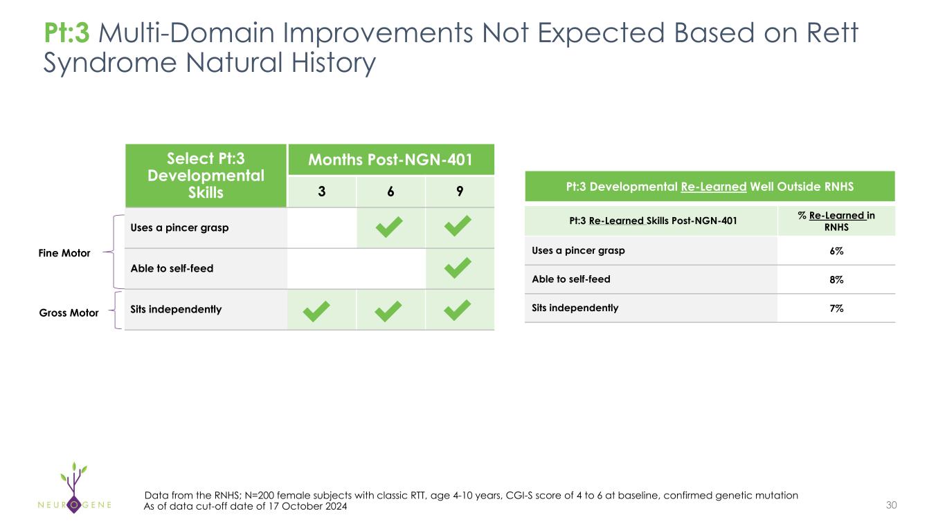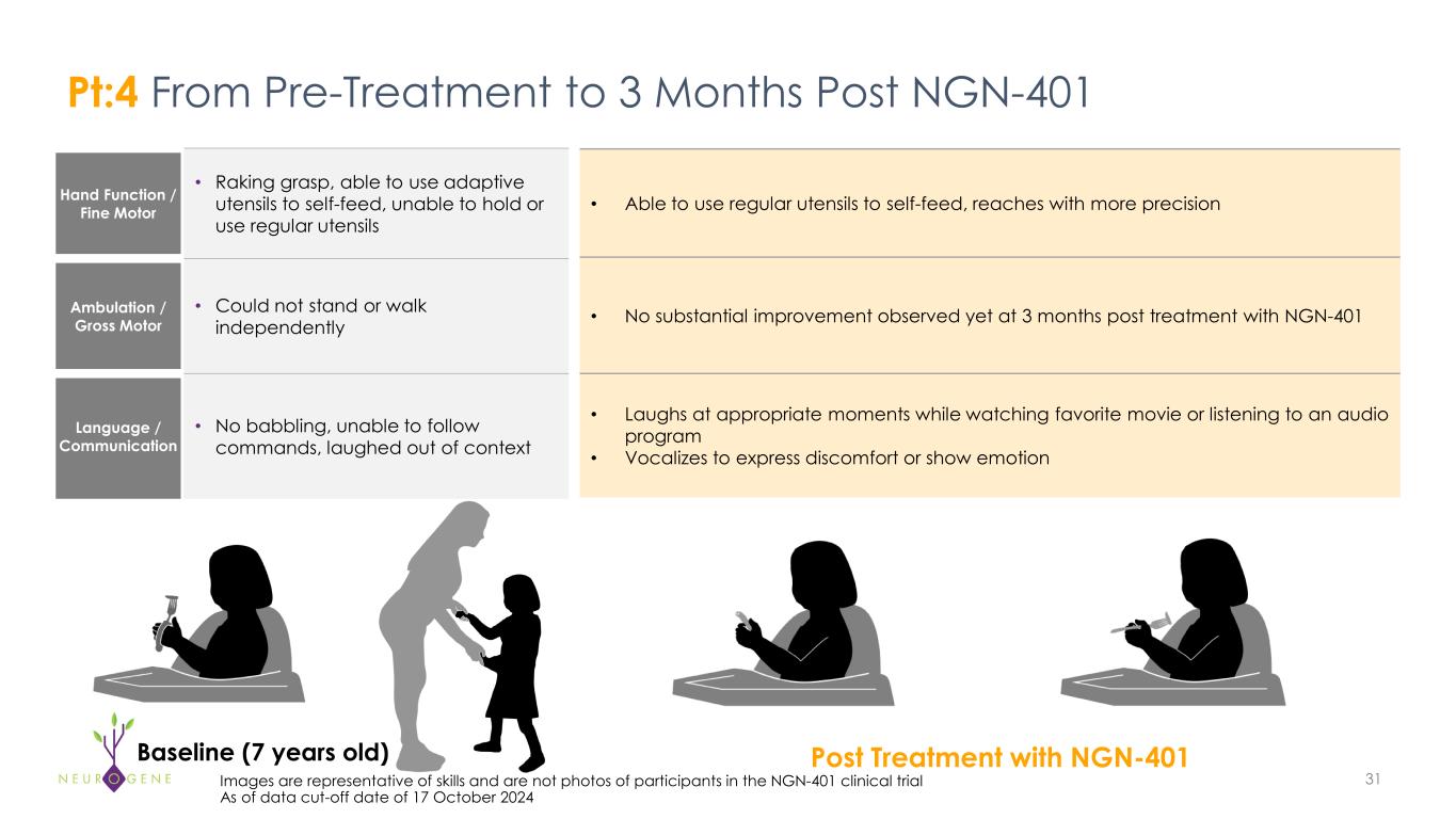 Pt:3 Multi-Domain Improvements Not Expected Based on Rett Syndrome Natural History 30 Select Pt:3 Developmental Skills Months Post-NGN-401 3 6 9 Uses a pincer grasp Able to self-feed Sits independently Data from the RNHS; N=200 female subjects with classic RTT, age 4-10 years, CGI-S score of 4 to 6 at baseline, confirmed genetic mutation As of data cut-off date of 17 October 2024 Pt:3 Re-Learned Skills Post-NGN-401 % Re-Learned in RNHS Uses a pincer grasp 6% Able to self-feed 8% Sits independently 7% Pt:3 Developmental Re-Learned Well Outside RNHS Fine Motor Gross Motor