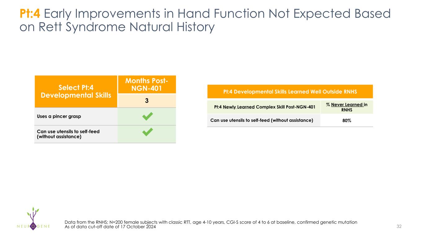 Hand Function / Fine Motor • Raking grasp, able to use adaptive utensils to self-feed, unable to hold or use regular utensils Ambulation / Gross Motor • Could not stand or walk independently Language / Communication • No babbling, unable to follow commands, laughed out of context 31Images are representative of skills and are not photos of participants in the NGN-401 clinical trial As of data cut-off date of 17 October 2024 • Able to use regular utensils to self-feed, reaches with more precision • No substantial improvement observed yet at 3 months post treatment with NGN-401 • Laughs at appropriate moments while watching favorite movie or listening to an audio program • Vocalizes to express discomfort or show emotion Pt:4 From Pre-Treatment to 3 Months Post NGN-401 Baseline (7 years old) Post Treatment with NGN-401