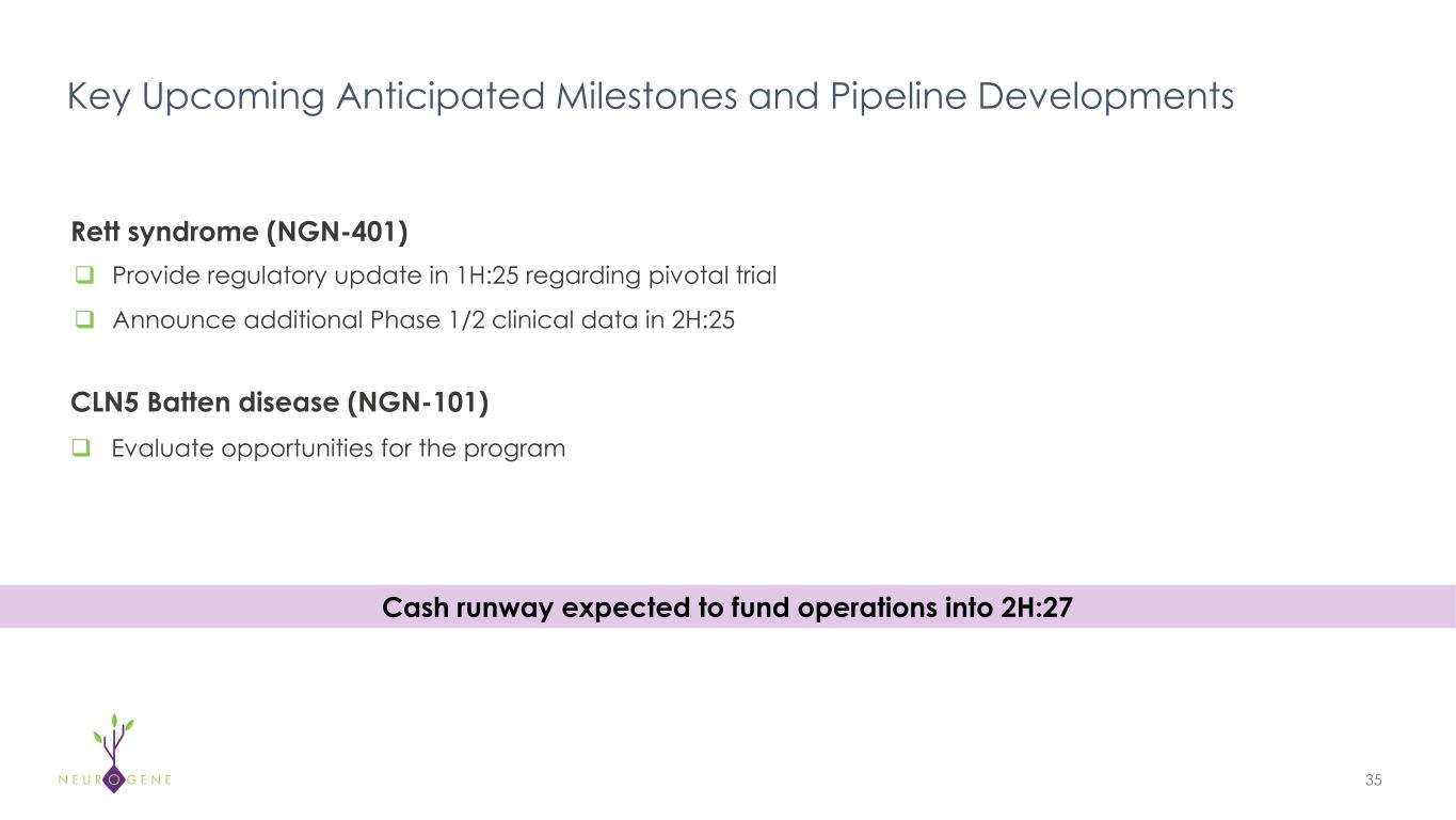Key Upcoming Anticipated Milestones and Pipeline Developments Rett syndrome (NGN-401) CLN5 Batten disease (NGN-101) Evaluate opportunities for the program 35 Cash runway expected to fund operations into 2H:27 Provide regulatory update in 1H:25 regarding pivotal trial Announce additional Phase 1/2 clinical data in 2H:25