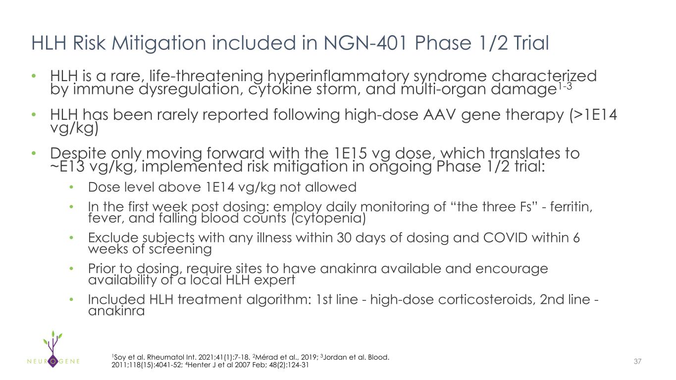 HLH Risk Mitigation included in NGN-401 Phase 1/2 Trial • HLH is a rare, life-threatening hyperinflammatory syndrome characterized by immune dysregulation, cytokine storm, and multi-organ damage1-3 • HLH has been rarely reported following high-dose AAV gene therapy (>1E14 vg/kg) • Despite only moving forward with the 1E15 vg dose, which translates to ~E13 vg/kg, implemented risk mitigation in ongoing Phase 1/2 trial: • Dose level above 1E14 vg/kg not allowed • In the first week post dosing: employ daily monitoring of “the three Fs” - ferritin, fever, and falling blood counts (cytopenia) • Exclude subjects with any illness within 30 days of dosing and COVID within 6 weeks of screening • Prior to dosing, require sites to have anakinra available and encourage availability of a local HLH expert • Included HLH treatment algorithm: 1st line - high-dose corticosteroids, 2nd line - anakinra 37 1Soy et al. Rheumatol Int. 2021;41(1):7-18. 2Mérad et al., 2019; 3Jordan et al. Blood. 2011;118(15):4041-52; 4Henter J et al 2007 Feb; 48(2):124-31