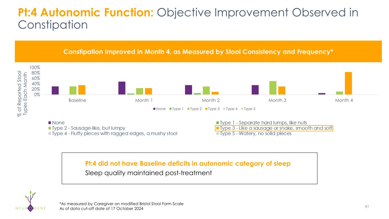 Beginning 3 months post-NGN-401, Pt:3 could swallow liquids, such as clear soup and water from a sippy cup, and chew and swallow soft items, such as meatballs and cooked carrots, without choking At 9 months post-NGN-401, she is now able to grasp food such as apple slices and self-feed At Baseline, Pt:3 had dysphagia requiring a pureed diet and had to be spoon- fed by caregiver due to aspiration Pt:3 Autonomic Function: Experienced Clinically Meaningful Improvement in Swallowing and Gained Ability to Self-feed 40 Pt:3 did not have Baseline deficits in autonomic categories of sleep or constipation • Sleep duration and quality maintained post-treatment • No change in Modified Bristol Stool Form Scale scores post-treatment As of data cut-off date of 17 October 2024