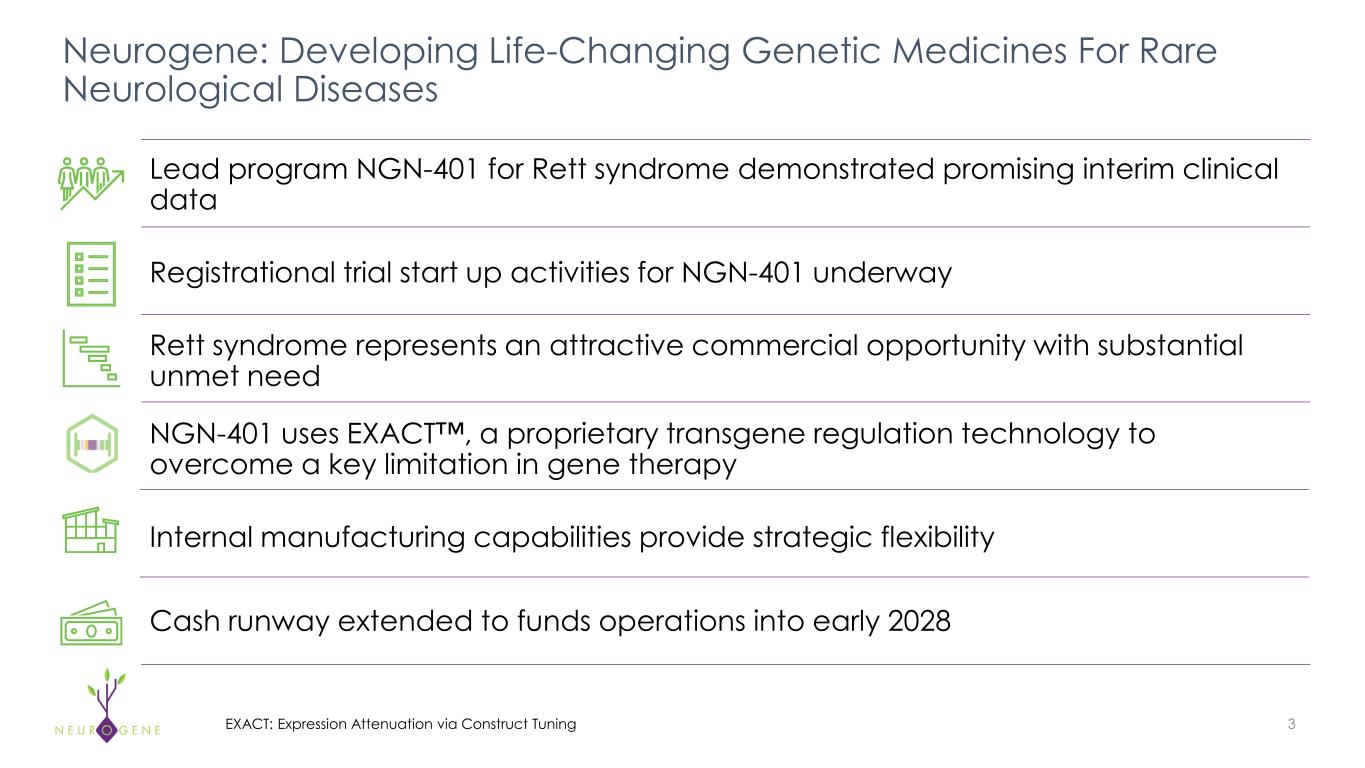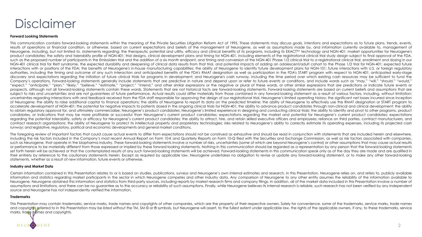 Cautionary Note Regarding Forward-Looking Statements Statements in this press release which are not historical in nature are intended to be, and hereby are identified as, forward-looking statements within the meaning of the Private Securities Litigation Reform Act of 1995. These statements may discuss goals, intentions and expectations as to future plans, trends, events, results of operations or financial condition, or otherwise, based on current expectations and beliefs of the management of Neurogene, as well as assumptions made by, and information currently available to, management of Neurogene, including, but not limited to, statements regarding: trial designs, clinical development plans and timing for NGN-401, including elements of the registrational clinical study trial design subject to final approval of the FDA, such as the proposed number of participants in the Embolden trial and the addition of a six month endpoint, and timing of the conversion of the NGN-401 Phase 1/2 clinical trial to a registrational clinical trial; expected future interactions with or positions of the FDA; the safety, tolerability and efficacy of NGN-401; the potential for success of the Embolden registrational clinical trial for NGN-401 for the treatment of Rett syndrome; expected timing for additional interim data from the Company’s NGN-401 Phase 1/2 trial for Rett Syndrome; the effectiveness of the monitoring and treatment protocol for HLH in Neurogene’s Phase 1/2 clinical trial of NGN-401; and the time period over which existing cash resources may be sufficient to fund the Company’s operations. Forward-looking statements generally include statements that are predictive in nature and depend upon or refer to future events or conditions, and include words such as “may,” “will,” “should,” “would,” “expect,” “anticipate,” “plan,” “likely,” “believe,” “estimate,” “project,” “intend,” “on track,” and other similar expressions or the negative or plural of these words, or other similar expressions that are predictions or indicate future events or prospects, although not all forward-looking statements contain these words. Forward-looking statements are based on current beliefs and assumptions that are subject to risks, uncertainties and assumptions that are difficult to predict with regard to timing, extent, likelihood, and degree of occurrence, which could cause actual results to differ materially from anticipated results and many of which are outside of Neurogene’s control.