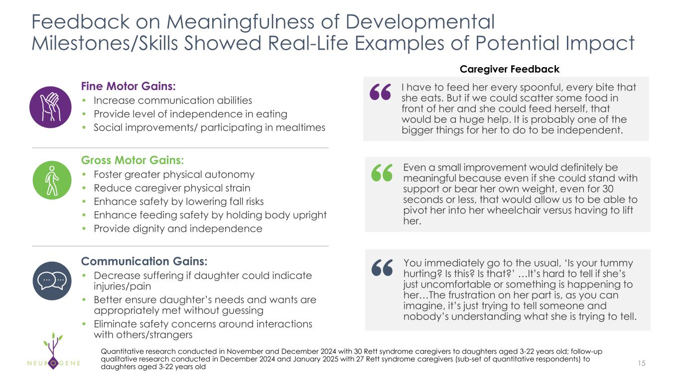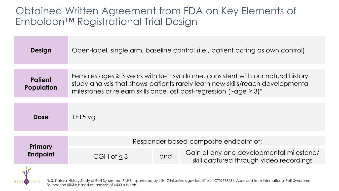 •Patient Population: Females ages ≥ 3 years with Rett syndrome, which is consistent with Neurogene’s analysis of the NIH-sponsored, International Rett Syndrome Foundation (IRSF) Rett syndrome natural history study that shows patients ages 3 and above rarely learn new skills/reach developmental milestones or relearn skills once lost. The FDA’s written agreement endorsed the Company’s analysis.