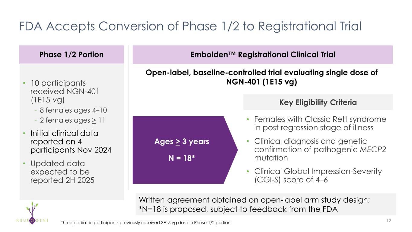 NEW YORK – June 30, 2025 – Neurogene Inc. (Nasdaq: NGNE), a clinical-stage company founded to bring life-changing genetic medicines to patients and families affected by rare neurological diseases, today announced details of Embolden™, the Company’s registrational clinical trial designed to evaluate NGN-401 gene therapy for the treatment of females with Rett syndrome in participants ages 3 years and older. The Company has written agreement from the U.S. Food and Drug Administration (FDA) on key aspects of the registrational trial’s design.