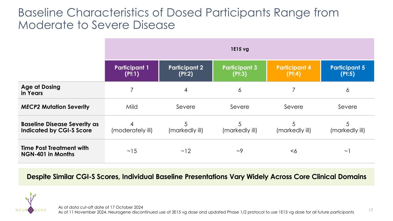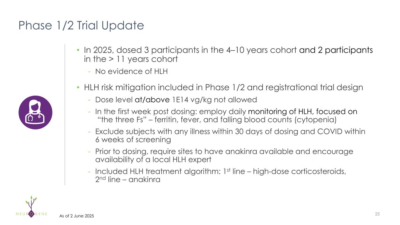 Neurogene previously shared that five additional participants had been dosed in the Phase 1/2 portion of the NGN-401 clinical trial during the first half of 2025. A total of 10 participants have received the 1E15 vg dose. There has been no evidence of hemophagocytic lymphohistiocytosis (HLH) / hyperinflammatory syndrome in any participant at the 1E15 vg dose level. Neurogene remains on track to share updated clinical efficacy and safety data in the second half of 2025.
