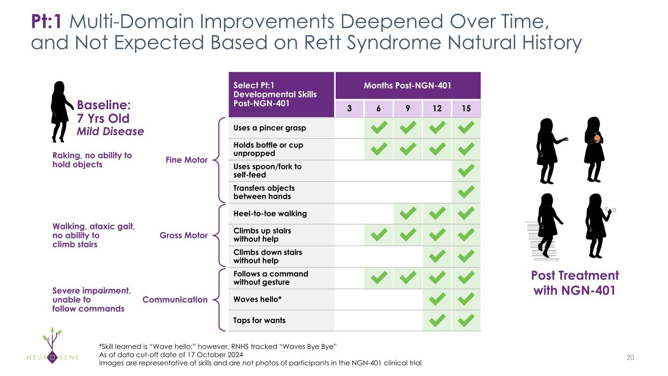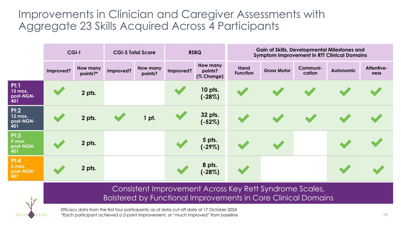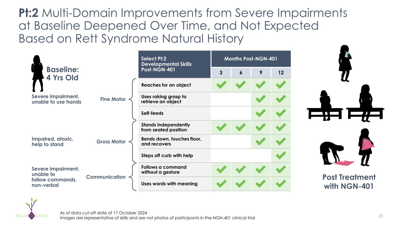 “I appreciate the multi-domain approach across the clinical manifestations of Rett syndrome, and rigor in which the primary endpoint will be evaluated, including both the clinician perspective of improvement using the CGI-I scale with Rett syndrome anchors and videos to demonstrate gains of skills that are clinically meaningful for girls and women with Rett syndrome and their families,” said Elizabeth M. Berry-Kravis, M.D., Ph.D., Professor of Pediatrics, Neurological Sciences and Biochemistry at Rush University, and principal investigator in the NGN-401 clinical trial. “Participants treated with NGN-401 have demonstrated increased independence, with both fine and gross motor function improvement, and gained the ability to better communicate wants, needs and choices. I have been impressed with the improvements observed in participants after NGN-401 administration, which have included global improvement in signs and symptoms of Rett syndrome and gains of multi-domain developmental milestones that would not be expected to occur spontaneously in the post-regression stage of Rett syndrome.