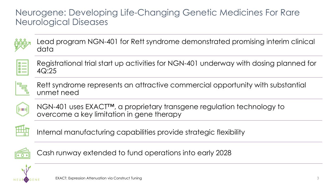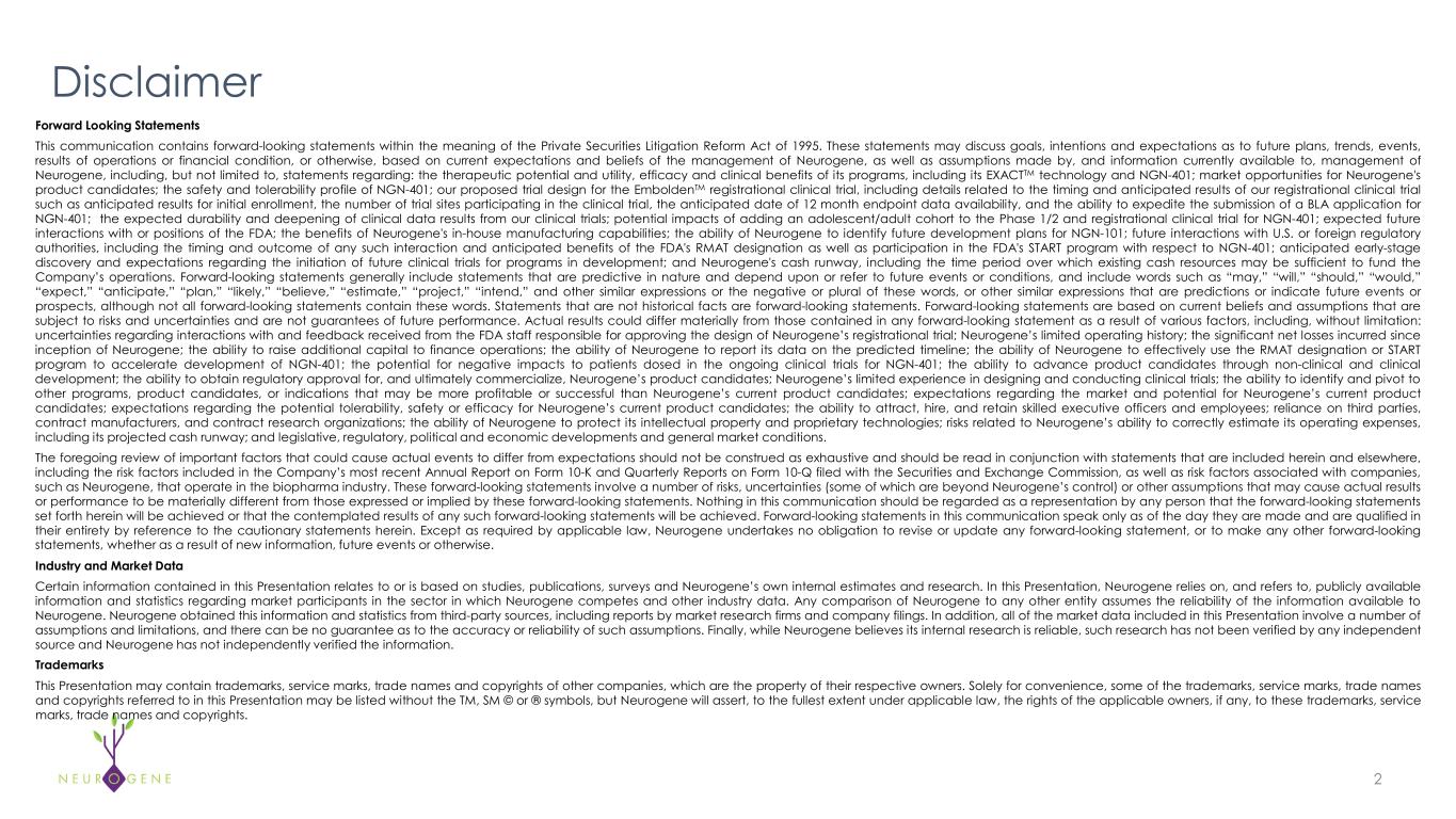 Forward-looking statements generally include statements that are predictive in nature and depend upon or refer to future events or conditions, and include words such as “may,” “will,” “should,” “would,” “expect,” “anticipate,” “plan,” “likely,” “believe,” “estimate,” “project,” “intend,” “on track,” and other similar expressions or the negative or plural of these words, or other similar expressions that are predictions or indicate future events or prospects, although not all forward-looking statements contain these words. Forward-looking statements are based on current beliefs and assumptions that are subject to risks, uncertainties and assumptions that are difficult to predict with regard to timing, extent, likelihood, and degree of occurrence, which could cause actual results to differ materially from anticipated results and many of which are outside of Neurogene’s control. Such risks, uncertainties and assumptions include, among other things, the risks and uncertainties identified under the heading "Risk Factors" included in Neurogene’s Annual Report on Form 10-K for the year ended December 31, 2024, filed with the Securities and Exchange Commission (SEC) on March 24, 2025, Neurogene’s Quarterly Report on Form 10-Q for the quarter ended June 30, 2025, filed with the SEC on August 11, 2025, and other filings that the Company has made and may make with the SEC in the future. Nothing in this communication should be regarded as a representation by any person that the forward-looking statements set forth herein will be achieved or that the contemplated results of any such forward-looking statements will be achieved. Forward-looking statements in this communication speak only as of the day they are made and are qualified in their entirety by reference to the cautionary statements herein. Except as required by applicable law, Neurogene undertakes no obligation to revise or update any forward-looking statement, or to make any other forward-looking statements, whether as a result of new information, future events or otherwise.