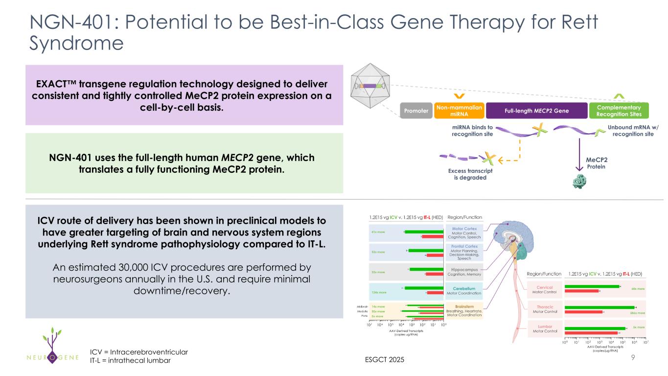 Dr. McMinn continued, “Feedback from the Rett syndrome community and KOLs reinforce that the decision to undergo gene therapy treatment is driven by a single critical factor: the potential for meaningful improvement. The route of administration data presented at the ESGCT Congress this week provide a potential rationale for the global improvement and multi-domain skill acquisition observed in our previously reported1 NGN-401 Phase 1/2 efficacy data. Importantly, the comparable systemic exposure between ICV and IT-L confirms there is no liver-sparing benefit to IT-L administration, consistent with clinical data from intra-CSF administered products.”