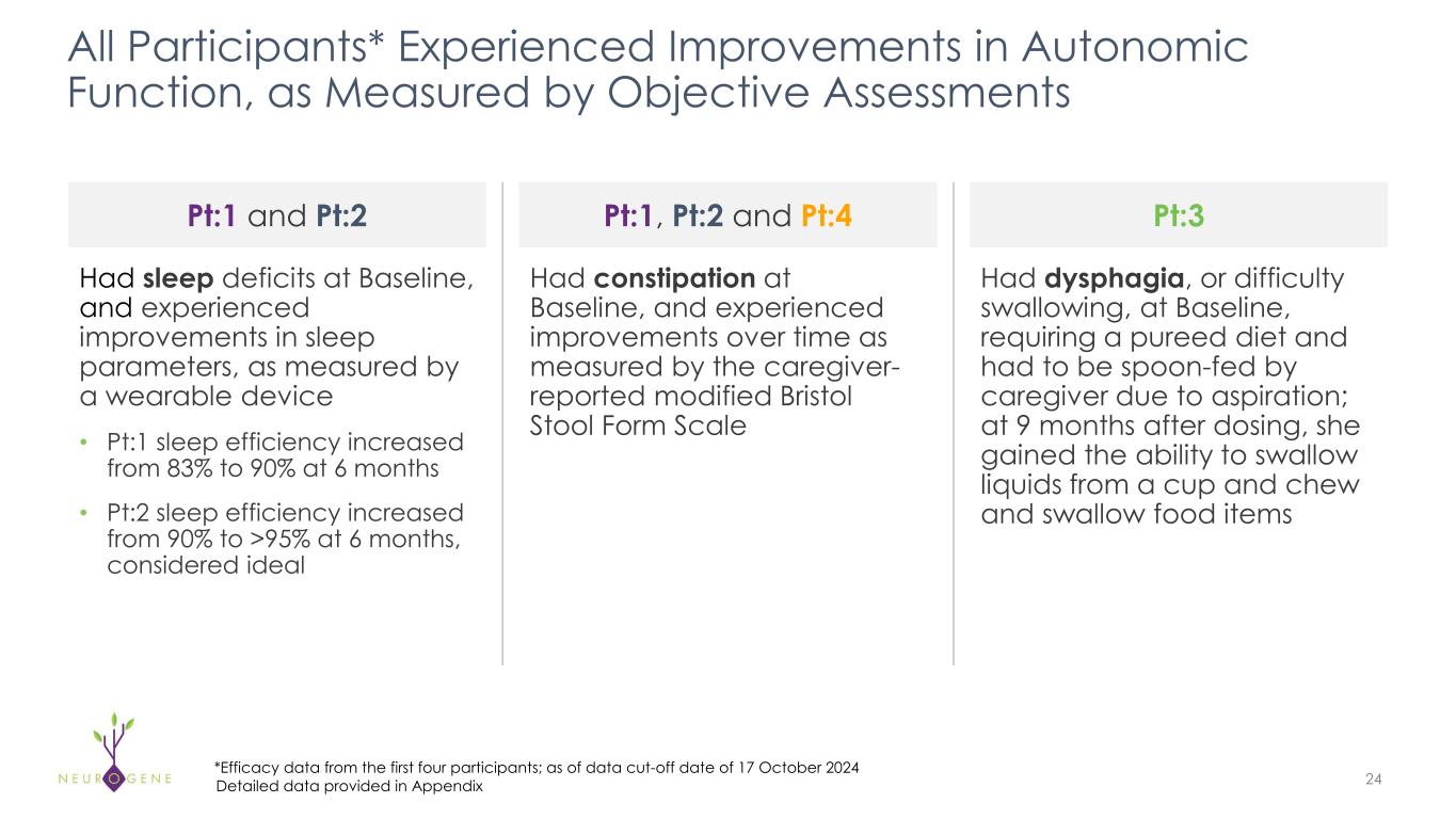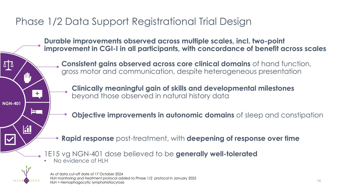 As previously reported, the first four participants in the NGN-401 Phase 1/2 trial gained 23 developmental milestones/skills, representing multi-domain improvement that requires transduction of key brain regions and nervous system
