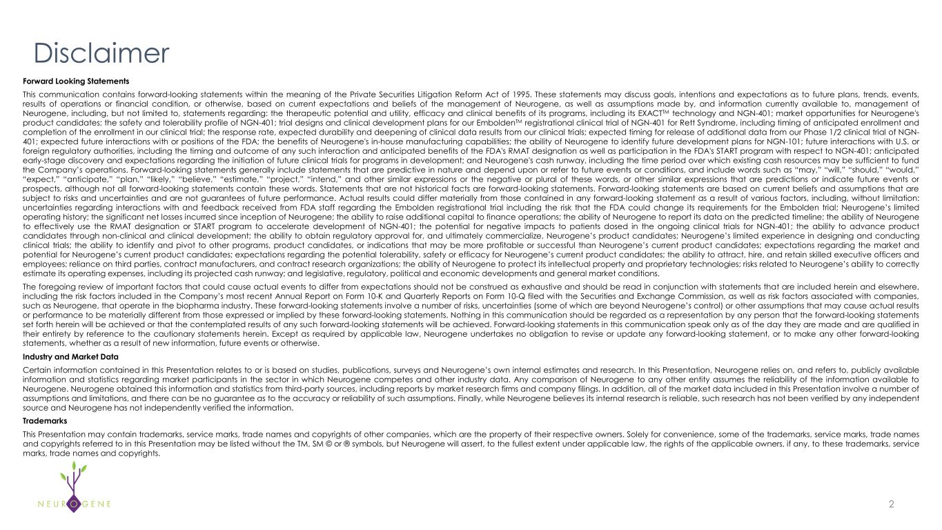 2 Disclaimer Forward Looking Statements This communication contains forward-looking statements within the meaning of the Private Securities Litigation Reform Act of 1995. These statements may discuss goals, intentions and expectations as to future plans, trends, events, results of operations or financial condition, or otherwise, based on current expectations and beliefs of the management of Neurogene, as well as assumptions made by, and information currently available to, management of Neurogene, including, but not limited to, statements regarding: the therapeutic potential and utility, efficacy and clinical benefits of its programs, including its EXACTTM technology and NGN-401; market opportunities for Neurogene's product candidates; the safety and tolerability profile of NGN-401; trial designs and clinical development plans for our EmboldenTM registrational clinical trial of NGN-401 for Rett Syndrome, including timing of anticipated enrollment and completion of the enrollment in our clinical trial; the response rate, expected durability and deepening of clinical data results from our clinical trials; expected timing for release of additional data from our Phase 1/2 clinical trial of NGN- 401; expected future interactions with or positions of the FDA; the benefits of Neurogene's in-house manufacturing capabilities; the ability of Neurogene to identify future development plans for NGN-101; future interactions with U.S. or foreign regulatory authorities, including the timing and outcome of any such interaction and anticipated benefits of the FDA's RMAT designation as well as participation in the FDA's START program with respect to NGN-401; anticipated early-stage discovery and expectations regarding the initiation of future clinical trials for programs in development; and Neurogene's cash runway, including the time period over which existing cash resources may be sufficient to fund the Company’s operations. Forward-looking statements generally include statements that are predictive in nature and depend upon or refer to future events or conditions, and include words such as “may,” “will,” “should,” “would,” “expect,” “anticipate,” “plan,” “likely,” “believe,” “estimate,” “project,” “intend,” and other similar expressions or the negative or plural of these words, or other similar expressions that are predictions or indicate future events or prospects, although not all forward-looking statements contain these words. Statements that are not historical facts are forward-looking statements. Forward-looking statements are based on current beliefs and assumptions that are subject to risks and uncertainties and are not guarantees of future performance. Actual results could differ materially from those contained in any forward-looking statement as a result of various factors, including, without limitation: uncertainties regarding interactions with and feedback received from FDA staff regarding the Embolden registrational trial including the risk that the FDA could change its requirements for the Embolden trial; Neurogene’s limited operating history; the significant net losses incurred since inception of Neurogene; the ability to raise additional capital to finance operations; the ability of Neurogene to report its data on the predicted timeline; the ability of Neurogene to effectively use the RMAT designation or START program to accelerate development of NGN-401; the potential for negative impacts to patients dosed in the ongoing clinical trials for NGN-401; the ability to advance product candidates through non-clinical and clinical development; the ability to obtain regulatory approval for, and ultimately commercialize, Neurogene’s product candidates; Neurogene’s limited experience in designing and conducting clinical trials; the ability to identify and pivot to other programs, product candidates, or indications that may be more profitable or successful than Neurogene’s current product candidates; expectations regarding the market and potential for Neurogene’s current product candidates; expectations regarding the potential tolerability, safety or efficacy for Neurogene’s current product candidates; the ability to attract, hire, and retain skilled executive officers and employees; reliance on third parties, contract manufacturers, and contract research organizations; the ability of Neurogene to protect its intellectual property and proprietary technologies; risks related to Neurogene’s ability to correctly estimate its operating expenses, including its projected cash runway; and legislative, regulatory, political and economic developments and general market conditions. The foregoing review of important factors that could cause actual events to differ from expectations should not be construed as exhaustive and should be read in conjunction with statements that are included herein and elsewhere, including the risk factors included in the Company’s most recent Annual Report on Form 10-K and Quarterly Reports on Form 10-Q filed with the Securities and Exchange Commission, as well as risk factors associated with companies, such as Neurogene, that operate in the biopharma industry. These forward-looking statements involve a number of risks, uncertainties (some of which are beyond Neurogene’s control) or other assumptions that may cause actual results or performance to be materially different from those expressed or implied by these forward-looking statements. Nothing in this communication should be regarded as a representation by any person that the forward-looking statements set forth herein will be achieved or that the contemplated results of any such forward-looking statements will be achieved. Forward-looking statements in this communication speak only as of the day they are made and are qualified in their entirety by reference to the cautionary statements herein. Except as required by applicable law, Neurogene undertakes no obligat