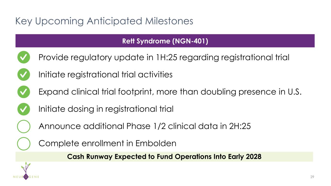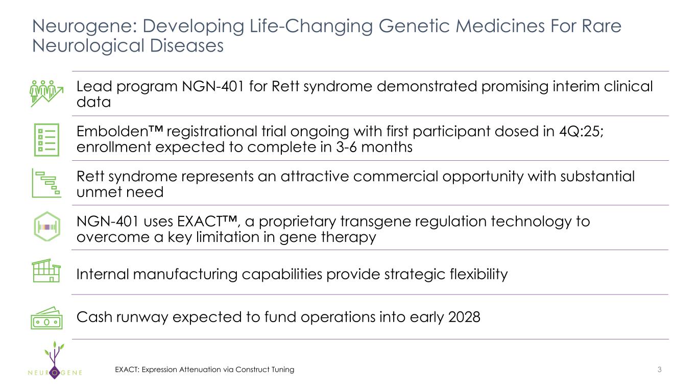 Neurogene: Developing Life-Changing Genetic Medicines For Rare Neurological Diseases 3EXACT: Expression Attenuation via Construct Tuning Lead program NGN-401 for Rett syndrome demonstrated promising interim clinical data Embolden registrational trial ongoing with first participant dosed in 4Q:25; enrollment expected to complete in 3-6 months Rett syndrome represents an attractive commercial opportunity with substantial unmet need NGN-401 uses EXACT , a proprietary transgene regulation technology to overcome a key limitation in gene therapy Internal manufacturing capabilities provide strategic flexibility Cash runway expected to fund operations into early 2028