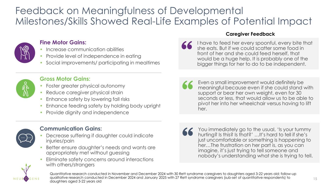 • Rett syndrome caregivers provided perspective on meaningfulness of gains of developmental milestones/skills in the core domains of Rett syndrome: fine motor, gross motor and communication • All skills queried, across all categories, were considered meaningful by majority of respondents • Caregivers indicated that Rett syndrome burden is immense, with 24-hour care needed to support their daughter’s needs • Skill gains or symptom improvement would provide respite not just to the patients, but to their caregiver(s), siblings, and extended family • Any skill gain or symptom improvement that would provide some level of independence/reduce dependence for their daughter would be highly meaningful 14 Quantitative research conducted in November and December 2024 with 30 Rett syndrome caregivers to daughters aged 3-22 years old; follow-up qualitative research conducted in December 2024 and January 2025 with 27 Rett syndrome caregivers (sub-set of quantitative respondents) to daughters aged 3-22 years old Rett Syndrome Caregiver Research Demonstrated Clinical Meaningfulness of Developmental Milestone/Skill Acquisition