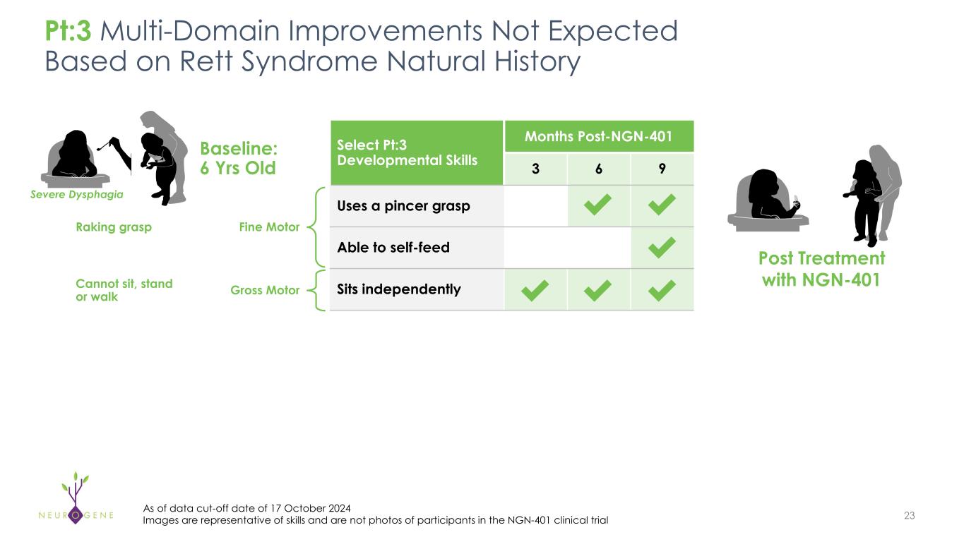 Pt:2 Multi-Domain Improvements from Severe Impairments at Baseline Deepened Over Time, and Not Expected 22 As of data cut-off date of 17 October 2024 Images are representative of skills and are not photos of participants in the NGN-401 clinical trial Select Pt:2 Developmental Skills Post-NGN-401 Months Post-NGN-401 3 6 9 12 Reaches for an object Uses raking grasp to retrieve an object Self-feeds Stands independently from seated position Bends down, touches floor, and recovers Steps off curb with help Follows a command without a gesture Uses words with meaning Fine Motor Gross Motor Communication Baseline: 4 Yrs Old Impaired, ataxic, help to stand Severe impairment, unable to use hands Severe impairment, unable to follow commands, non-verbal Based on Rett Syndrome Natural History Post Treatment with NGN-401