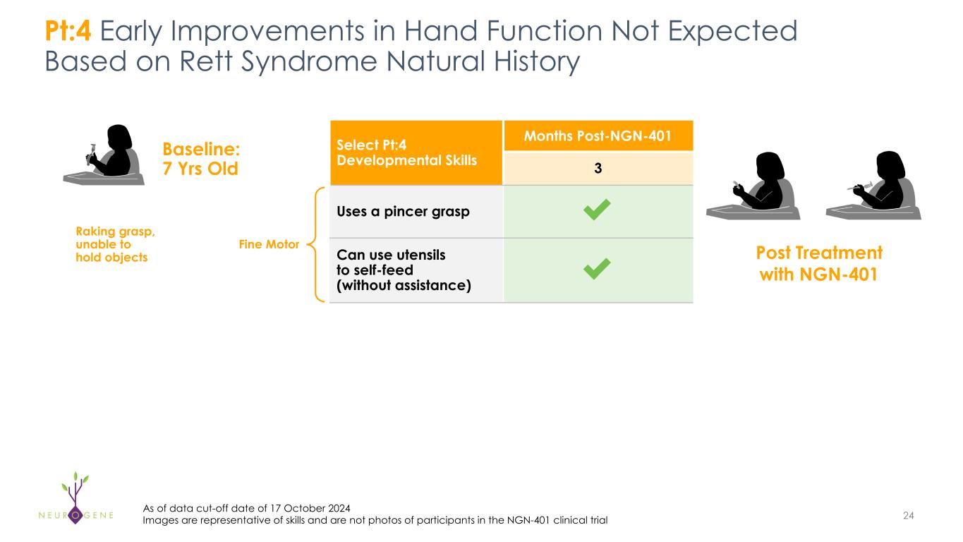 Fine Motor Gross Motor Pt:3 Multi-Domain Improvements Not Expected Based on Rett Syndrome Natural History 23 As of data cut-off date of 17 October 2024 Images are representative of skills and are not photos of participants in the NGN-401 clinical trial Select Pt:3 Developmental Skills Months Post-NGN-401 3 6 9 Uses a pincer grasp Able to self-feed Sits independently Baseline: 6 Yrs Old Cannot sit, stand or walk Raking grasp Post Treatment with NGN-401 Severe Dysphagia