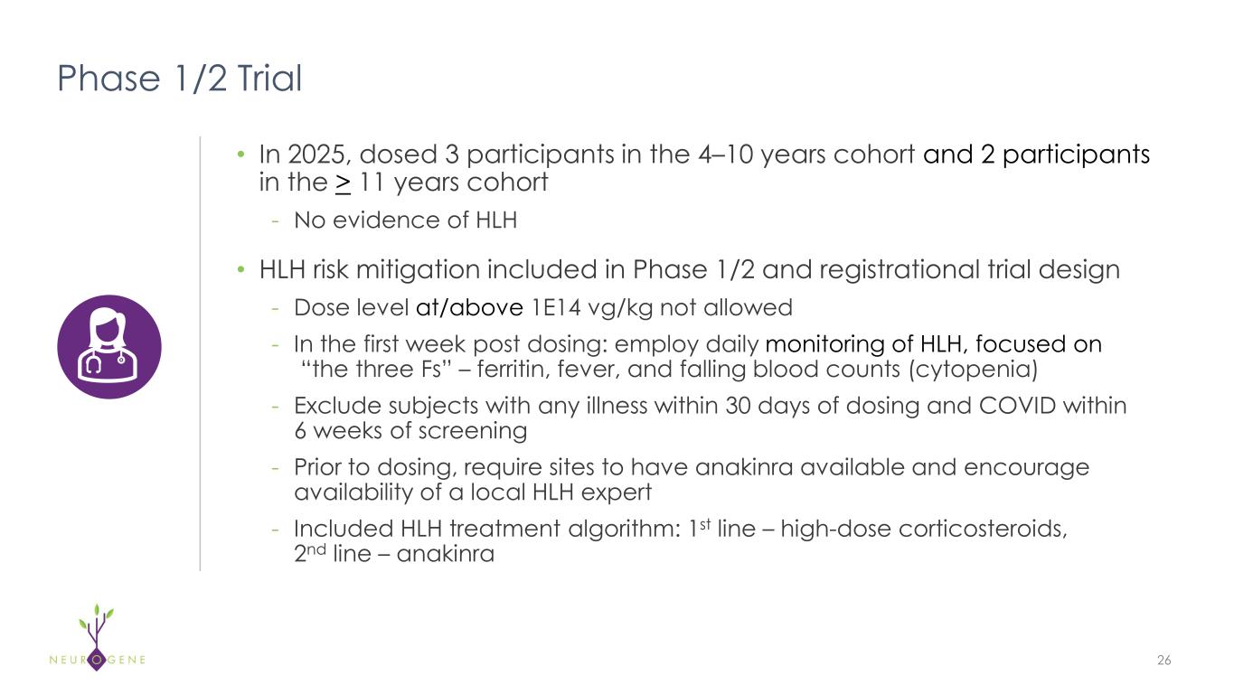 • In 2025, dosed 3 participants in the 4–10 years cohort and 2 participants in the > 11 years cohort - No evidence of HLH • HLH risk mitigation included in Phase 1/2 and registrational trial design - Dose level at/above 1E14 vg/kg not allowed - In the first week post dosing: employ daily monitoring of HLH, focused on “the three Fs” – ferritin, fever, and falling blood counts (cytopenia) - Exclude subjects with any illness within 30 days of dosing and COVID within 6 weeks of screening - Prior to dosing, require sites to have anakinra available and encourage availability of a local HLH expert - Included HLH treatment algorithm: 1st line – high-dose corticosteroids, 2nd line – anakinra 26 Phase 1/2 Trial