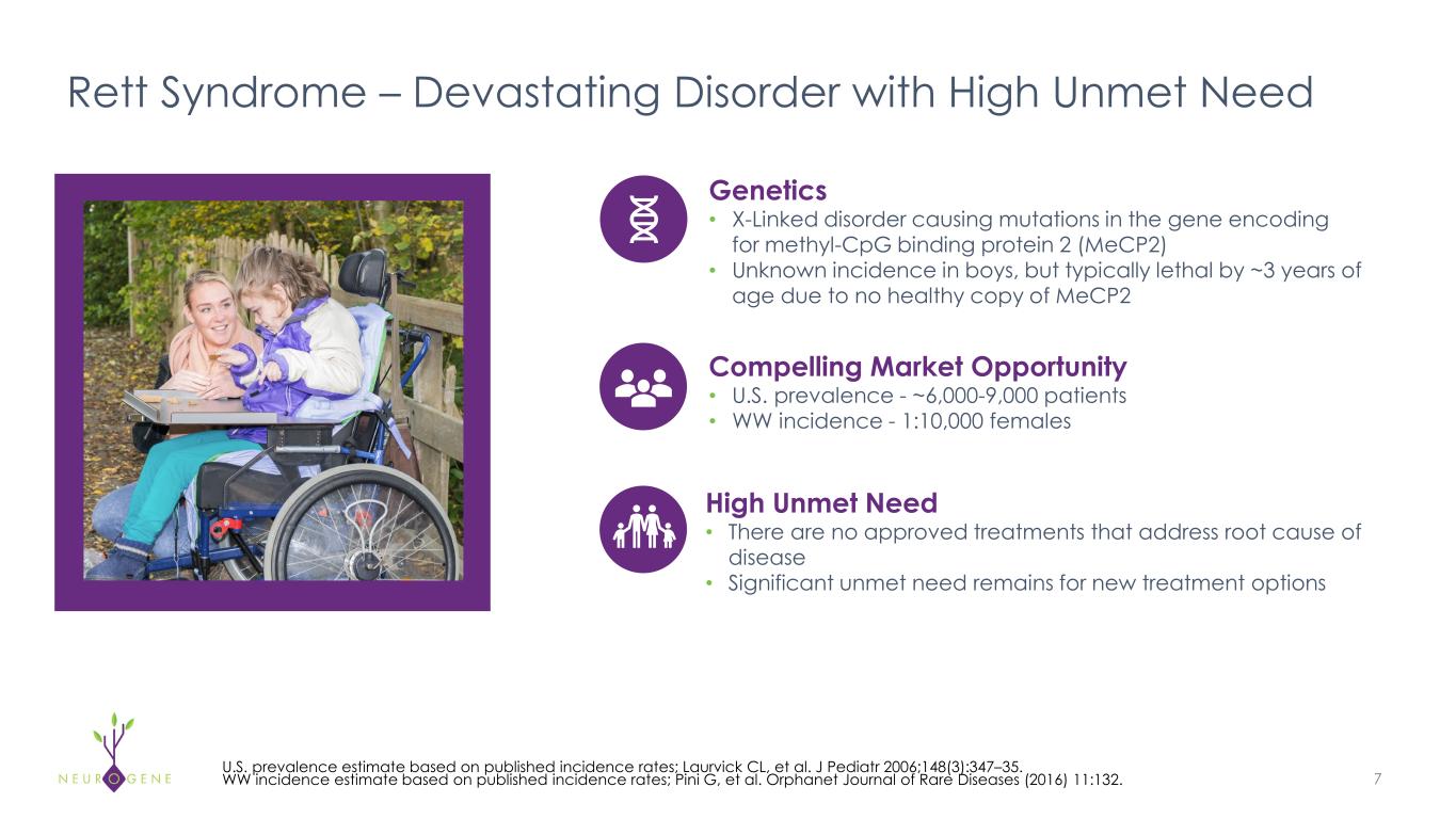「ニューロジーン社の創立者であり最高経営責任者であるレイチェル・マクミン博士は、次のように述べています。「私たちはこの四半期にレット症候群を対象としたNGN-401遺伝子治療臨床プログラムを大きく前進させ、エンボルデン登録試験において、今後3~6ヶ月の間に急速に試験を登録する計画を可能にする13施設中12施設を開始した後、最初の参加者を投与しました。「昨日発表されたNGN-401フェーズ1/2試験の小児コホートからの良好な中間臨床データは、発達/マイルストーン・スキルの継続的獲得に伴う多領域にわたる持続的な成長を示しており、NGN-401の治療的有望性を裏付けています。2028年第1四半期までのキャッシュランウェイを持つ当社は、切望されている遺伝子治療をレット症候群の人々に提供するための強力な財務状態にあります。