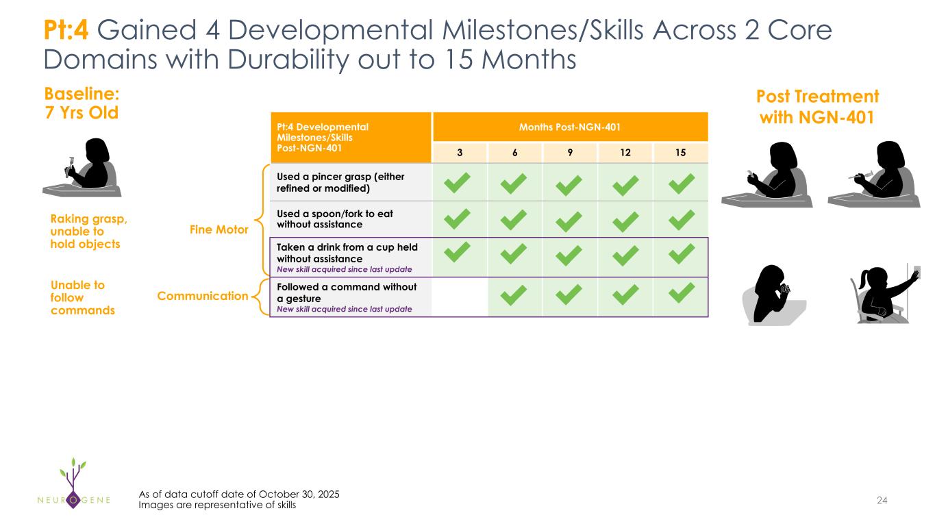 -第 1/2 相試験の小児コホート(4~10 歳コホート)における NGN-401 の最新の中間臨床デー タを報告。データカットオフ日である 2025 年 10 月 30 日時点で、発達のマイルスト ーンやスキルの獲得が継続し、多領域にわたる持続的な成長を示している。